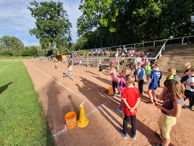 Am 20. September 2023 wurde es richtig sportlich in Kitzscher, denn die Grundschule veranstaltete den alljährlichen Schulsporttag. Bei diesem stand neben dem Sport an sich, vor allem auch der damit verbundene Spaß im Vordergrund. Die Klassen 1-4 durften sich dabei an vielen verschiedenen Stationen im Stadion sowie in der Grundschule sportlich betätigen. Diese hatten dabei vor allem einen kindgerechten Charakter und machten den Mädchen und Jungen gerade deshalb sehr viel Spaß. So gab es bei den sehr abwechslungsreichen Stationen verschiedene Disziplinen wie beispielweise einen ausgefallenen Gummistiefel-Weitwurf, das klassische Sackhüpfen, den herausfordernden Weitsprung, eine witzige Kleidungsstaffel, das altbekannte Tauziehen, ein etwas anderes Hockeyspiel – mit Regenschirmen als Schläger und Zitronen als Ball – oder auch das coole Basketballwerfen. Dabei waren das noch längst nicht alle, der vielen großartigen organisierten Angebote.