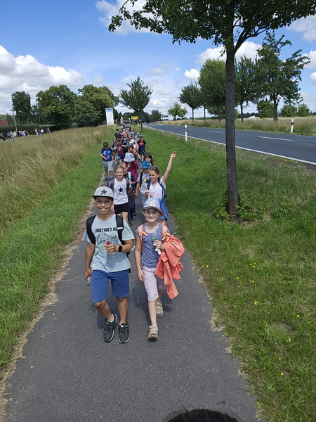 … hieß es mal wieder am 18. Juni zu unserem alljährlichen Schulwandertag. Alle Klassen der Grundschule Kitzscher wanderten an diesem Tag von der Schule aus zum Sportplatz Thierbach. Unterwegs wurden die Klassen 1 - 3 von den Viertklässlern begleitet, welche ihren Schulkameradinnen und Schulkameraden auf der Wanderung verschiedene Rätselaufgaben stellten oder auch Spiele mit den Kindern durchführten. Das sorgte für viel Spaß und lies die Zeit rasch verstreichen, bis die Klassen die Endstation Sportplatz erreichten. Dort angekommen konnten sich die Kinder auf verschiedenste Art und Weise beschäftigen. So wurde gepicknickt und auch Fußball, Federball, UNO sowie weiteres gespielt. Gekrönt wurde dieser Tag durch eine Überraschung: Für alle Kinder gab es Eis! Danach konnte dann gut gelaunt als auch ausgepowert der Heimweg angetreten werden.