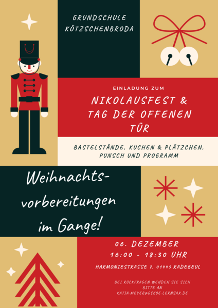 Es ist Tradition bei uns, jedes Jahr am Nikolaustag, einen gemütlichen Weihnachtsmarkt zu organisieren, um unseren Kindern die Möglichkeiten zu geben, Weihnachtsgeschenke* für ihre Eltern, Großeltern und Freunde zu basteln. Aber auch Familien die unsere Schule kennenlernen wollen, sind herzlich eingeladen über unseren Weihnachtsmarkt zu schlendern. Unser Förderverein stellt sich vor und kommt gerne mit den Eltern ins Gespräch! *teilweise geringer Unkostenbeitrag