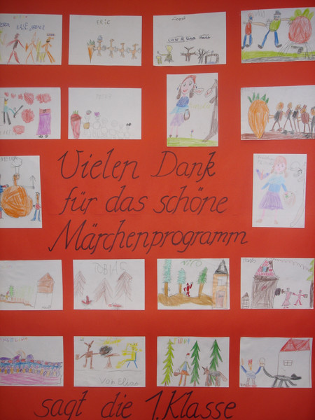 Unter anderem waren wir zum Märchenprogramm der 2. Klasse eingeladen, die uns mit verschiedenen Märchenliedern und dem Nachspiel der Märchen Rotkäppchen", "Der dicke fette Pfannkuchen", "Die große Rübe" und "Der Löwe und der Hase" erfreuten. Da es uns viel Spaß gemacht hatte, bedankten wir uns mit diesen Bildern bei unseren Mitschülern.