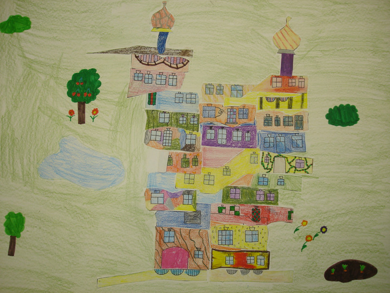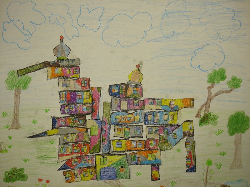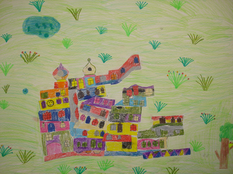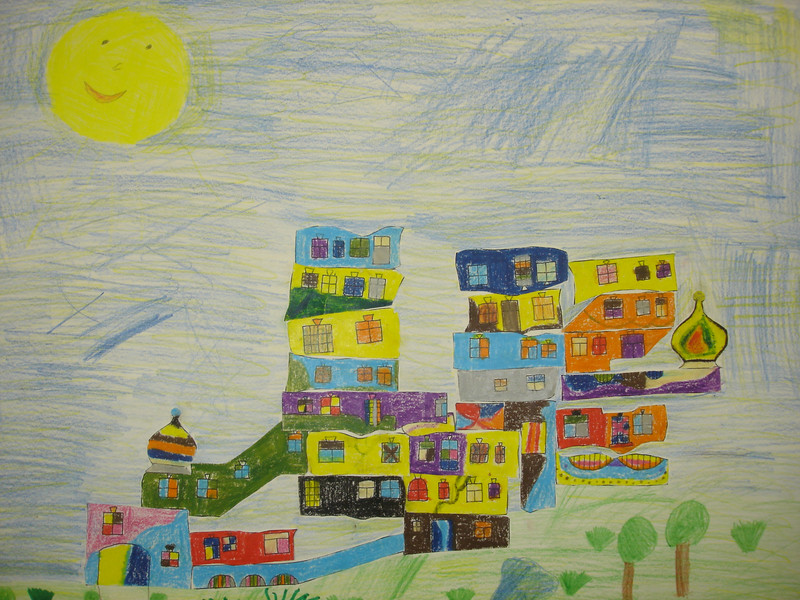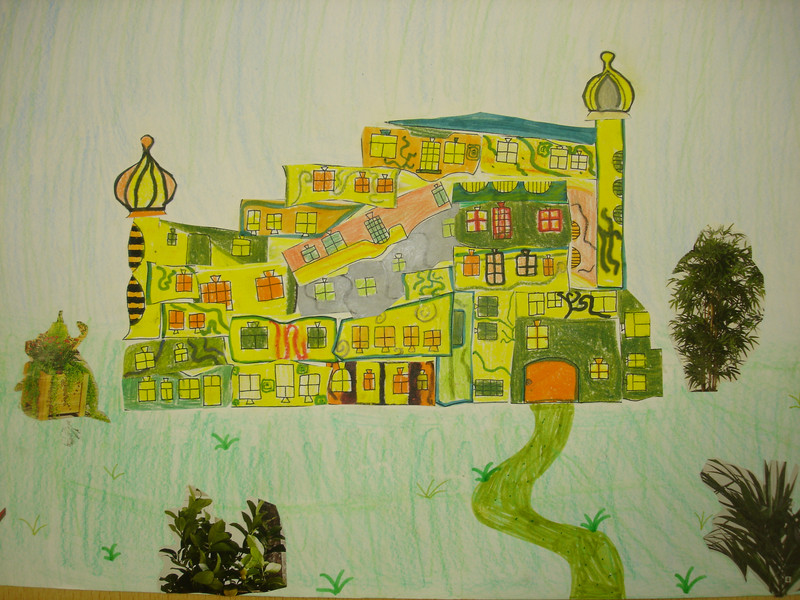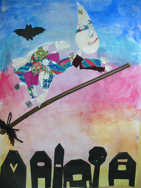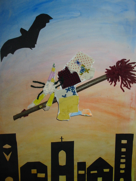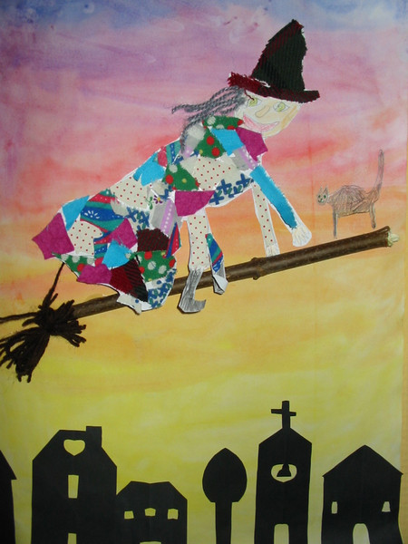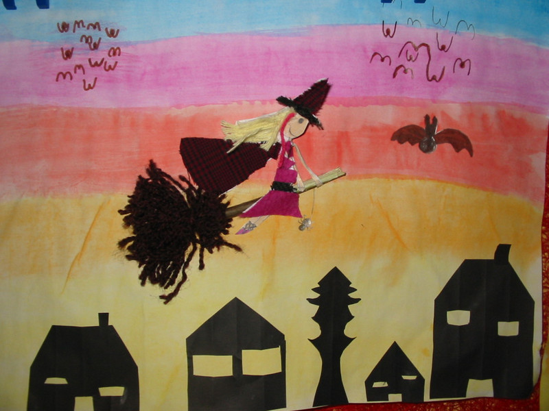 Schülerarbeiten Halloween - Die Hexe fliegt über unsere Stadt Weihnachtssterne MeinTraumhaus nach Friedensreich Hundertwasser Blumen im Kornfeld