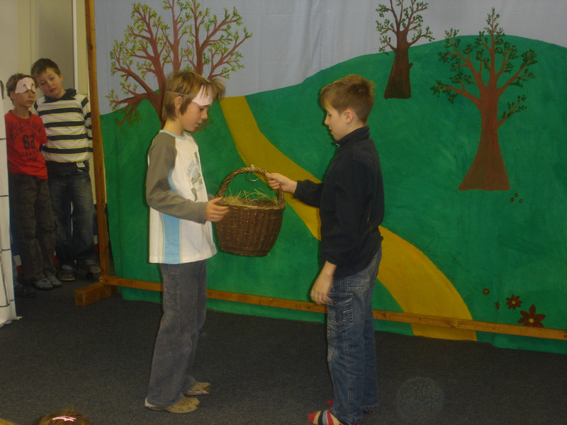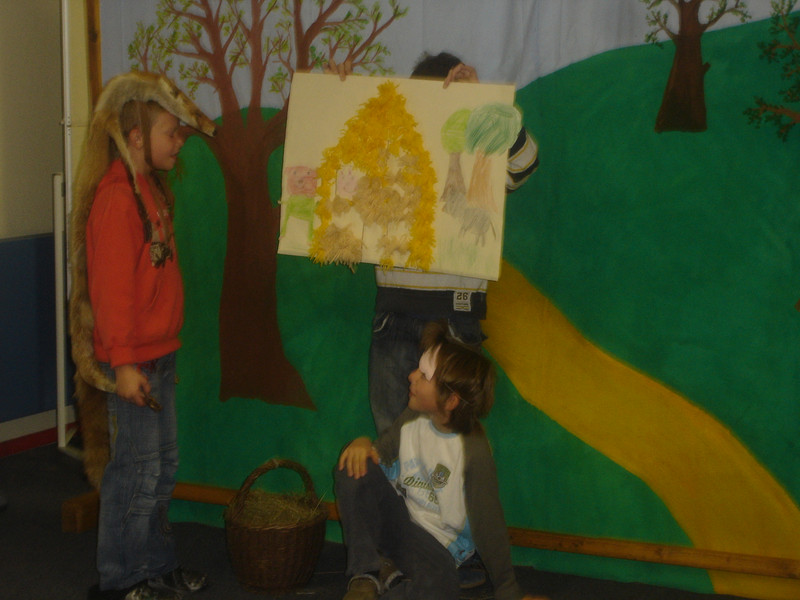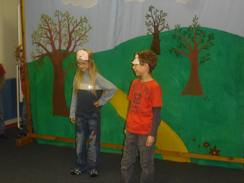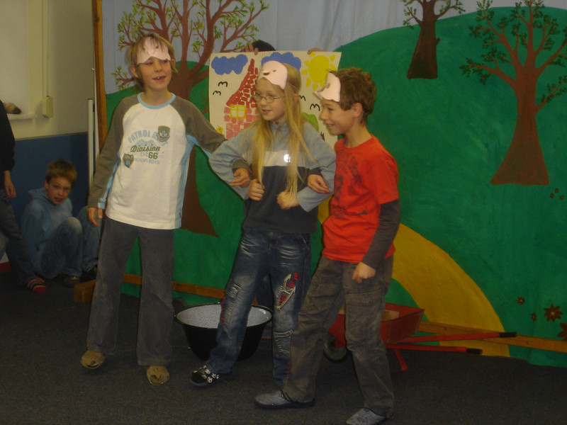 Unsere Viertklässler erlangten während des Lernprozesses so viel Sicherheit, dass sie sich entschlossen, das Stück der 2. und 3. Klasse vorzuspielen. Es bereitete Schauspielern wie Zuschauern viel Freude und motivierte zu weiterem kreativen Umgang mit der Fremdsprache.