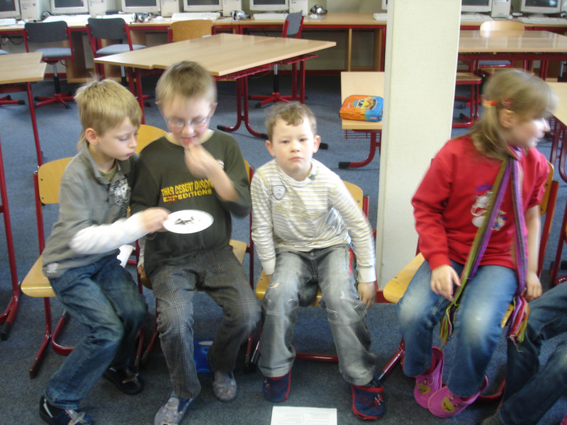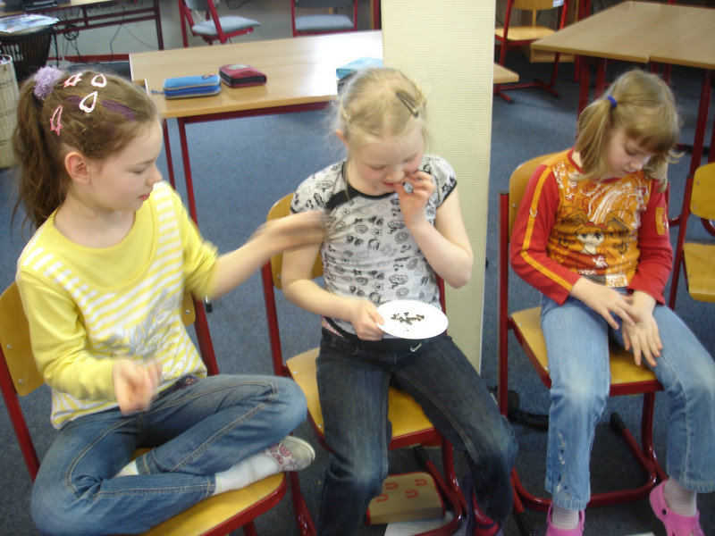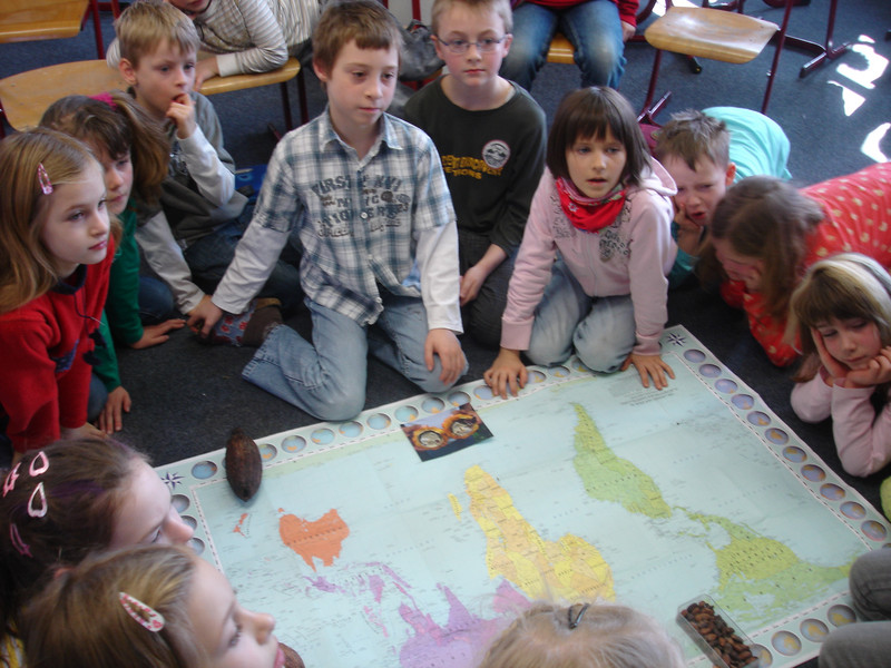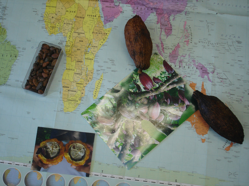 Frau Grass vermittelte uns viel Wissenswertes rund um den Kakao. Wir lernten die Anbaugebiete sowie das typische Aussehen des Kakaobaumes und deren Früchte kennen. Anhand eines Berichtes eines 8- jährigen Mädchens erfuhren wir Näheres über die schwere, schlecht bezahlte Arbeit auf dem Feld, aber auch über die Organisation, die sich für fairen Handel einsetzt. Wir konnten die einzelnen Schritte der Verarbeitung nachvollziehen und wissen nun, was alles zu tun ist bis aus einer Kakaoschote eine Tafel Schokolade wird. Ein besonderes Geschmackserlebnis war für viele ein Stückchen gepresster Kakao ohne Zuckerzusatz.