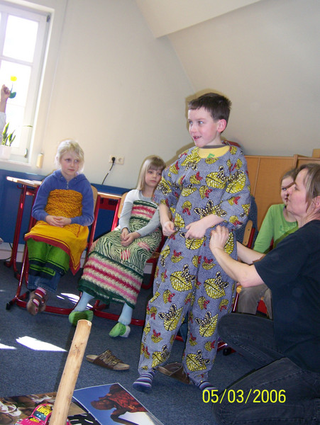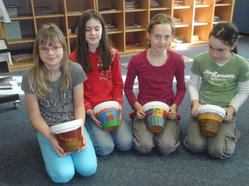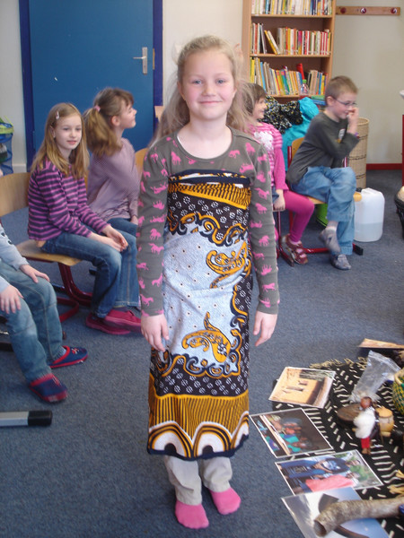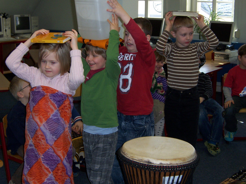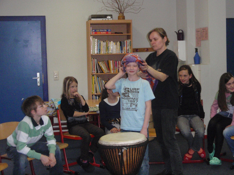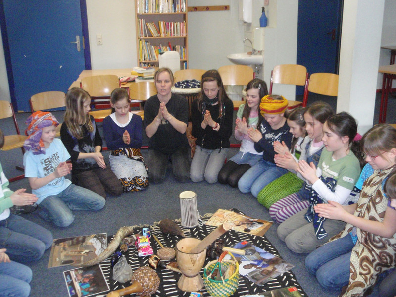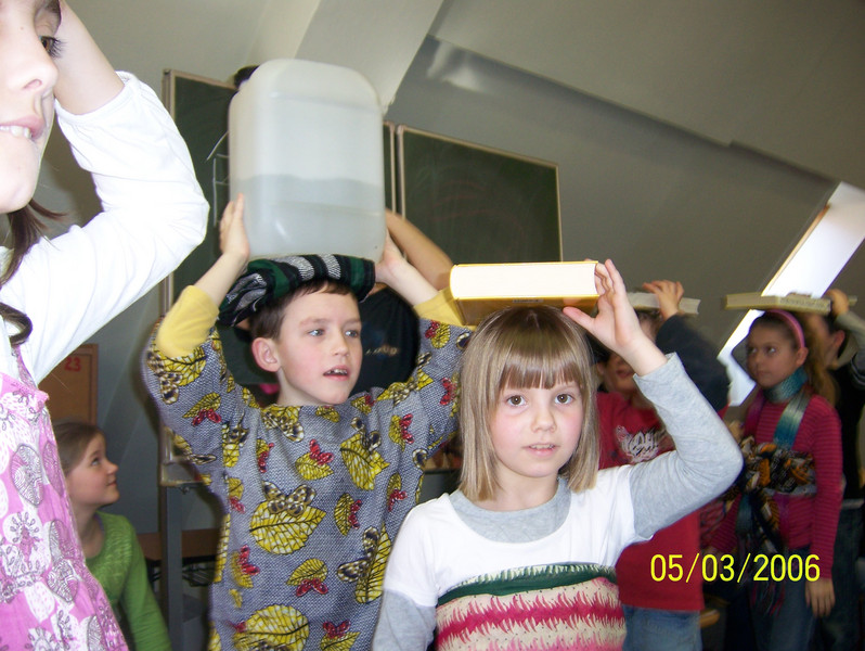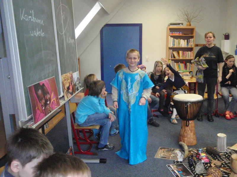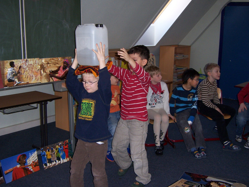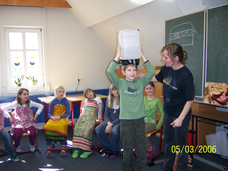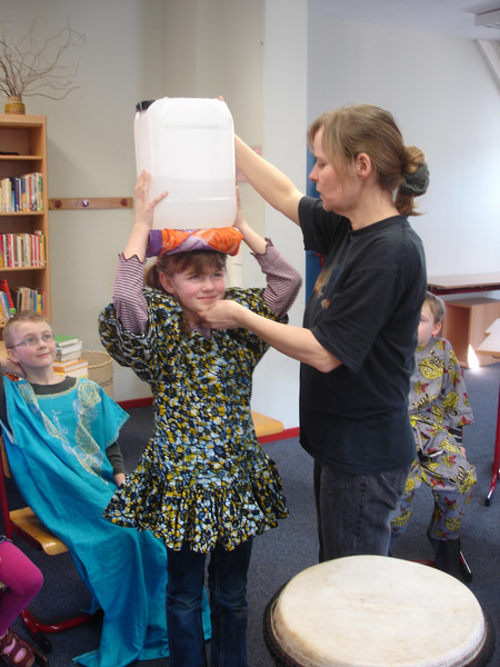 Mit Unterstützung von Frau Jane Grass wurden alle Schüler in das tägliche Leben der afrikanischen Menschen eingeführt und konnten das Tragen von Kangas und deren verschiedene Bedeutungen kennenlernen. Aber auch das Balancieren von Wasserbehältern auf dem Kopf vermittelte einen nachhaltigen Eindruck von den unterschiedlichen Lebensbedingungen.