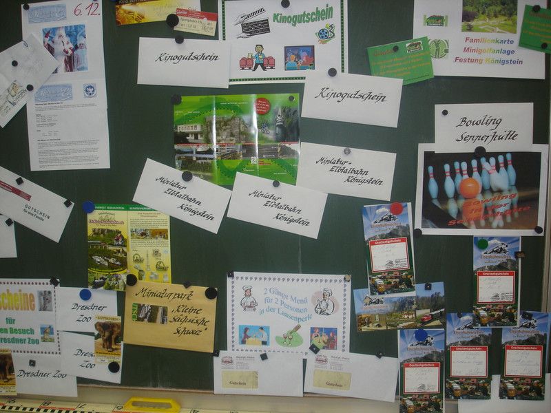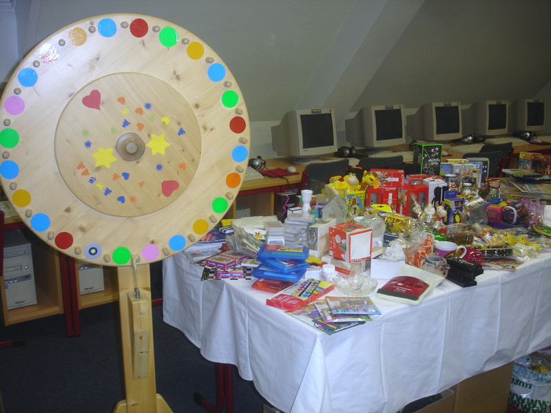 Glücksrad Das Glücksrad war auch in diesem Jahr wieder ein Anziehungspunkt für Jung und Alt. Viele attraktive Hauptpreise vom Riesenplüschbären bis zum Eintrittsgutschein in den Zoo lockten unsere Schüler, aber auch zahlreiche Gäste an die Drehscheibe.