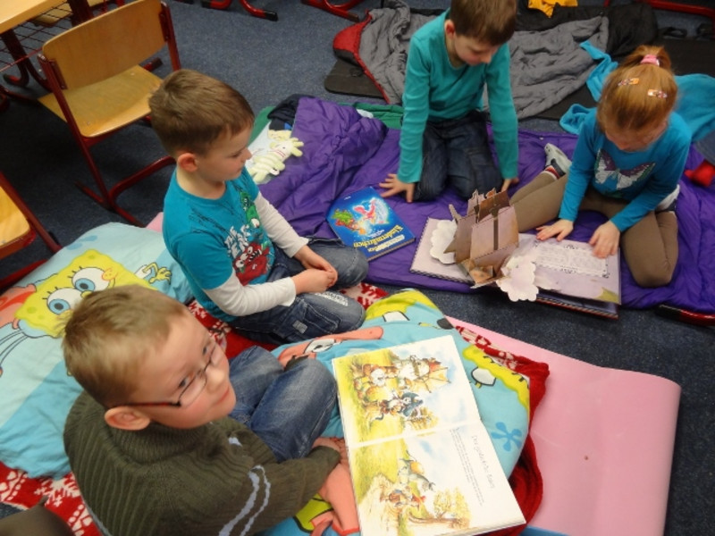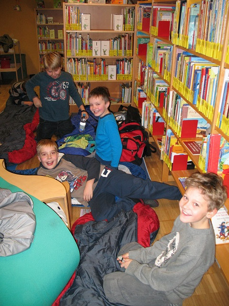 Unsere gruselig-märchenhafte Lesenacht in der Bibliothek von Pirna Pauline Richter und Mutti berichten: Unsere Klasse 4 hat eine aufregende Lesenacht in der Bibliothek Pirna erleben dürfen. Zu Beginn mussten wir ein Märchenrätsel lösen. In Teamarbeit haben wir in der Kinderabteilung verschwundene Buchseiten finden müssen. Nach dem Lösen kniffliger Aufgaben konnten wir erfolgreich die verlorenen Seiten vom „Tapferen Schneiderlein“ in die richtige Reihenfolge sortieren. Dann haben wir gemeinsam das Märchen vollständig gelesen. Danach stärkten wir uns bei einem märchenhaften Buffet. Im Anschluss erlebten wir eine schaurig-gruselige Führung durch das Bibliotheksgebäude. Zu später Stunde bauten wir unsere Schlafnester und konnten noch mit unseren Taschenlampen bis zum Einschlafen in spannenden Büchern schmökern. Es wurde sehr früh am Morgen, als wir endlich nach den aufregenden Erlebnissen eingeschlafen sind. Ein leckeres Müsli-Frühstück konnten wir dann gut gebrauchen. Helenas Eltern waren so lieb und brachten uns frisches Obst, andere Leckerein und starken Kaffee für unsere noch sehr müden Betreuer. Dass wir dieses Erlebnis erfahren durften, ist Dank Herrn Melzer, Frau Richter und unserer Klassenleiterin Frau Richter möglich gewesen und natürlich der finanziellen Unterstützung aller Eltern.