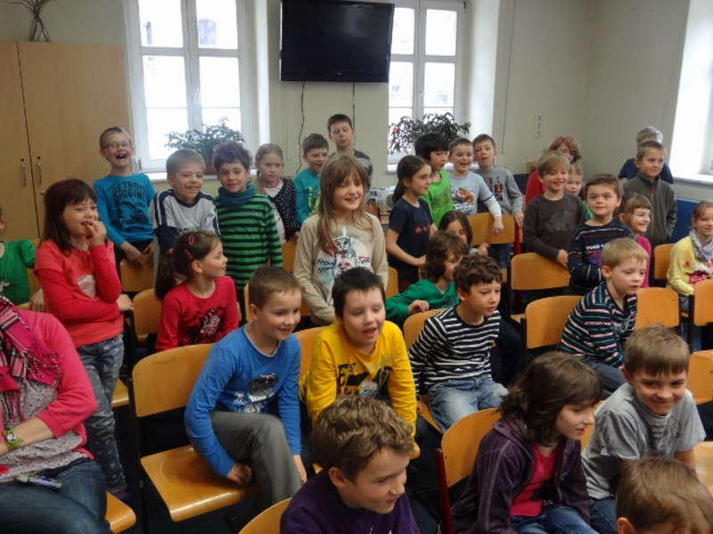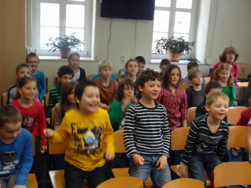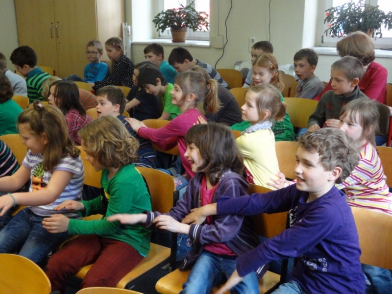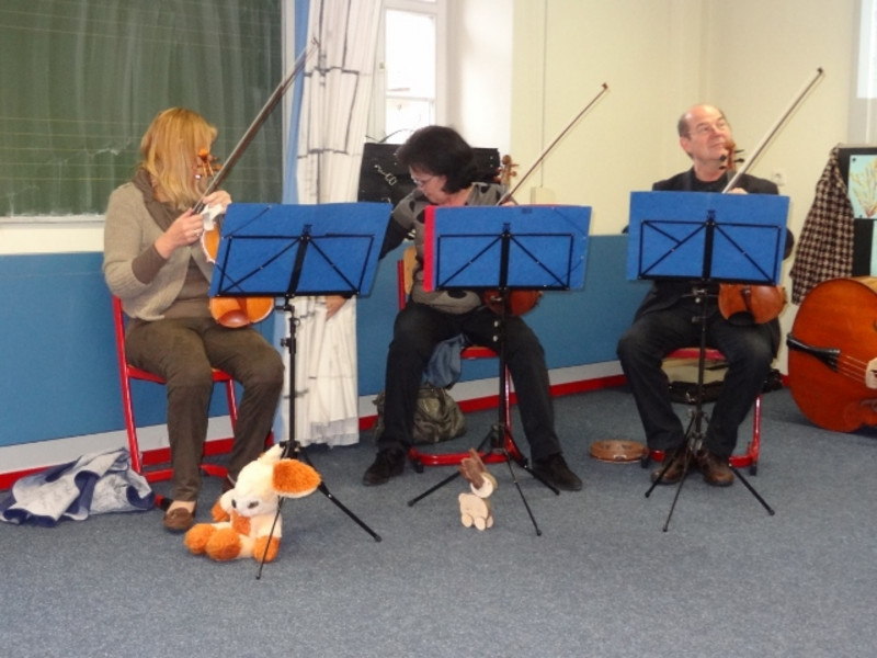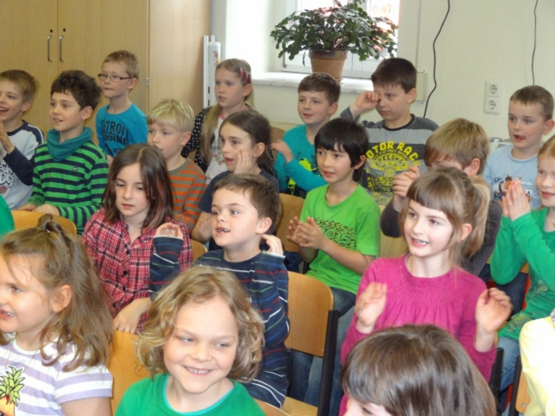 Ein besonderes musikalisches Erlebnis stimmte uns alle auf das bevorstehende Osterfest ein. Ein Streicherquintett der Elblandphilharmonie nahm uns mit auf eine Reise durch alle Kontinente und deren Osterbräuche. Musik verschiedener Stilrichtungen versetzte uns in unterschiedliche Stimmungen von nachdenklich bis fröhlich. Toll war, dass wir Liedteile mitsingen konnten, dabei sogar mehrere Sprachen verwendeten und im immer schneller werdenden "Sitztanz" richtig in Bewegung kamen. Durch die Umrahmung mit Informationen zu den Osterfeierlichkeiten anderer Länder, die uns eine Beamerprojektion schön veranschaulichte, wurde diese Stunde zu einem wissenswertem musikalischem Osterei.