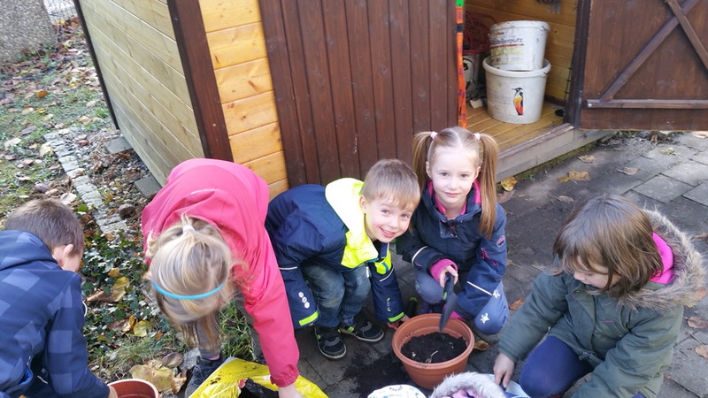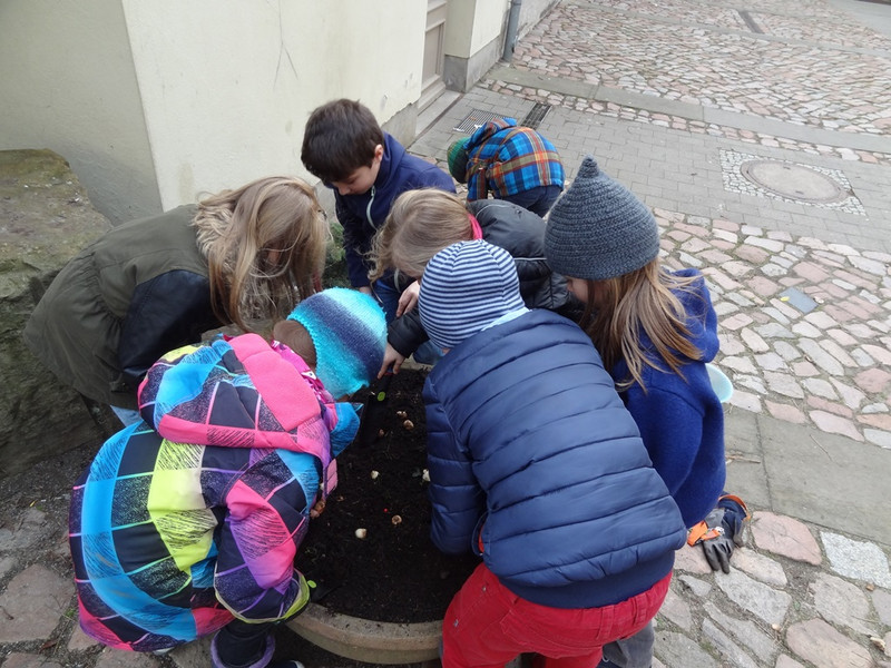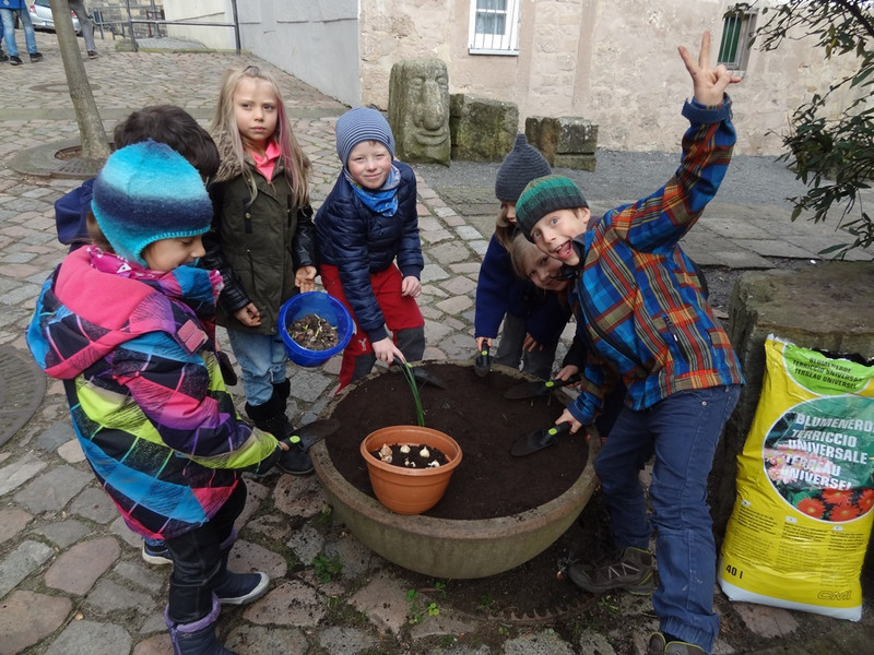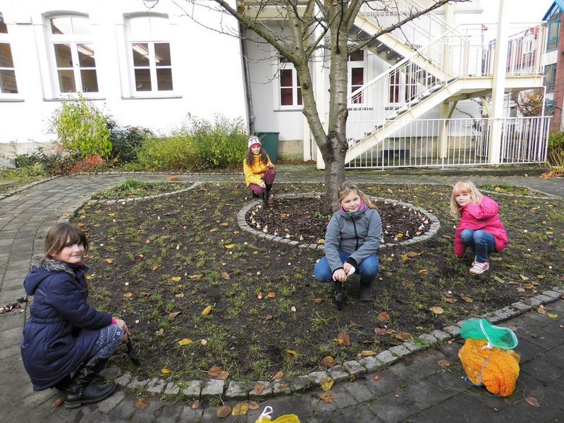 Jetzt in der eher grauen Jahreszeit erinnern wir uns gern an die farbenfrohen Tage, insbesondere den Frühling, in dem in unserem Schulgarten die Tulpen, Narzissen, Krokusse und Traubenhyazinthen prächtig erblühten. Damit er auch im nächsten Frühjahr wieder in so ein strahlendes Meer von Farben taucht, an dem wir uns erfreuen können, pflanzten Schüler aller Grundschulklassen im November weitere hunderte Frühblüher. Diese Blumenzwiebeln wurden von Bulbs4Kids kostenlos bereitgestellt, einer Organisation, welche die Kinder auf diese Weise spielerisch mit der Natur und ihren Vorgängen vertraut machen möchte. Wir Lehrer und Schüler nutzen die Kampagne, die gleichzeitig ein Wettbewerb um die „Goldene Blumenzwiebel 2018“ ist, gern um in der praktischen Tätigkeit unser Wissen über Frühblüher zu erweitern, Zusammenhänge zu erkennen und unsere Schulumgebung zu verschönern. Unsere kleinen Gärtner werden die Entwicklung der Pflanzen weiterhin beobachten, dokumentieren und den grünen Daumen drücken, dass alle neu gepflanzten Zwiebelblumen gut gedeihen und im Frühjahr ihre Blütenpracht entfalten.
