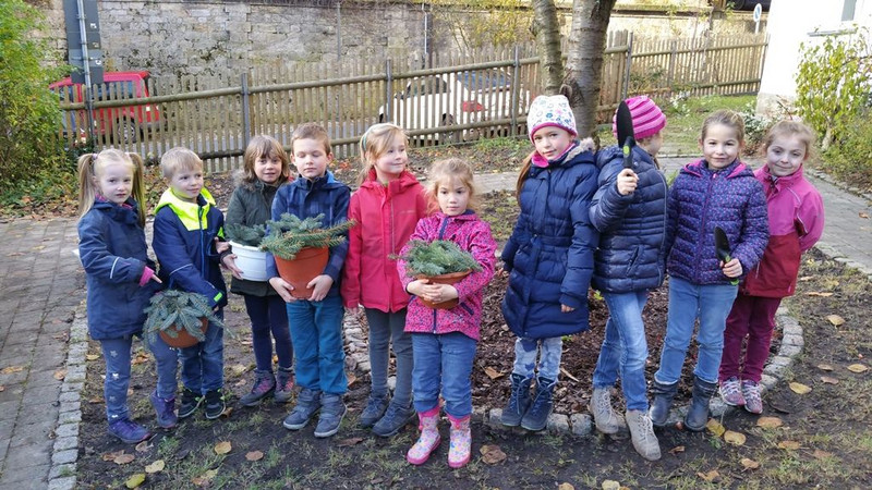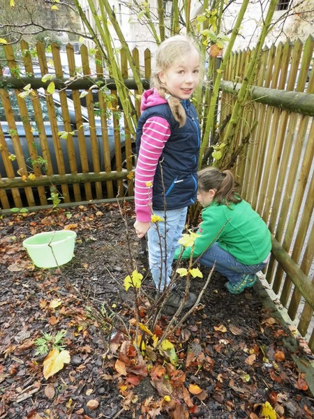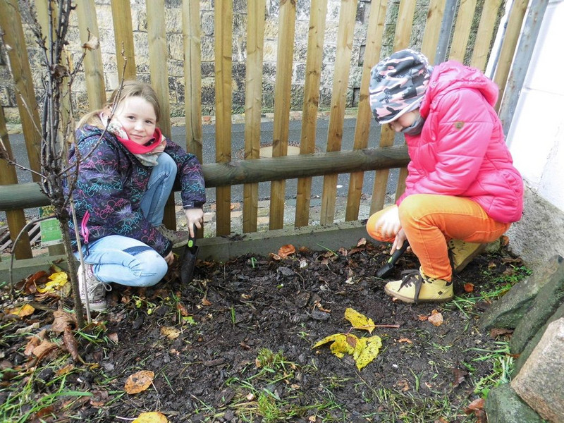 Die Klasse 3 entwickelten kreative Ideen beim Anordnen der Blumenzwiebeln im Bereich des Zaunes Richtung Mühlgasse.