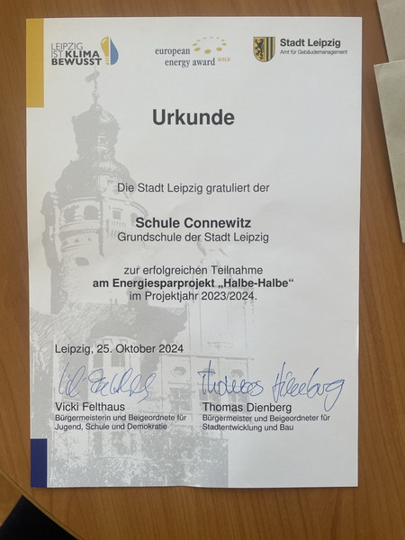 Seit dem Schuljahr 2023/24 nimmt die Schule Connewitz an Programm „HalbeHalbe“ der Stadt Leipzig teil. Dabei geht es darum, dass Kinder und Erwachsene nach ihren Möglichkeiten helfen, Strom, Wärme und Wasser sinnvoll zu nutzen: So viel wie nötig, so wenig wie möglich. Eine wichtige Rolle hat der Hausmeister, der die Heizungsanlage richtig einstellt, kaputte Wasserhähne repariert und auch sonst unser ganzes großes Haus im Blick hat. Letztes Schuljahr hat das so gut geklappt, dass wir in allen drei Gebieten (Strom, Wärme, Wasser) sparen konnten und somit zur Auszeichnungsveranstaltung eingeladen wurden. Clara war mit dabei und berichtet uns, wie es war: