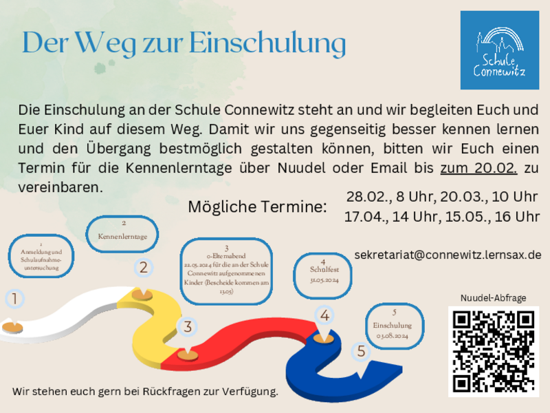 Alle Kinder, die einen Aufnahmebescheid für die Schule Connewitz erhalten, sind herzlich eingeladen, einen Kennenlernnachmittag zu begehen. Ihr trefft eure zukünftigen Mitschüler:innen und Lehrkräfte und Horterzieherinnen der zukünftigen 1. Klassen. Bringt eure Eltern mit, denn es wir ein Elterncafé geben, wo sich auch die Erwachsenen schon kennenlernen können.