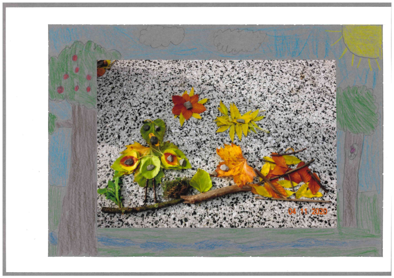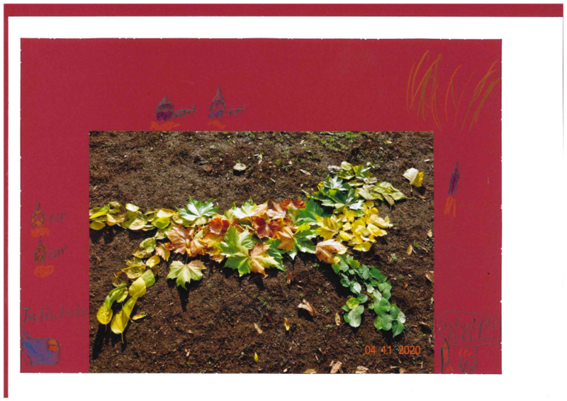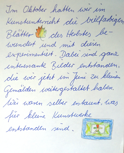 Im Oktober hatten wir im Kunstunterricht die vielfarbigen Blätter des Herbstes bewundert und mit diesen experimentiert. Dabei sind ganz interessante Bilder entstanden, die wir jetzt im Juni zu kleinen Gemälden weitergestaltet haben. Wir waren selber erstaunt, was für kleine Kunstwerke entstanden sind.