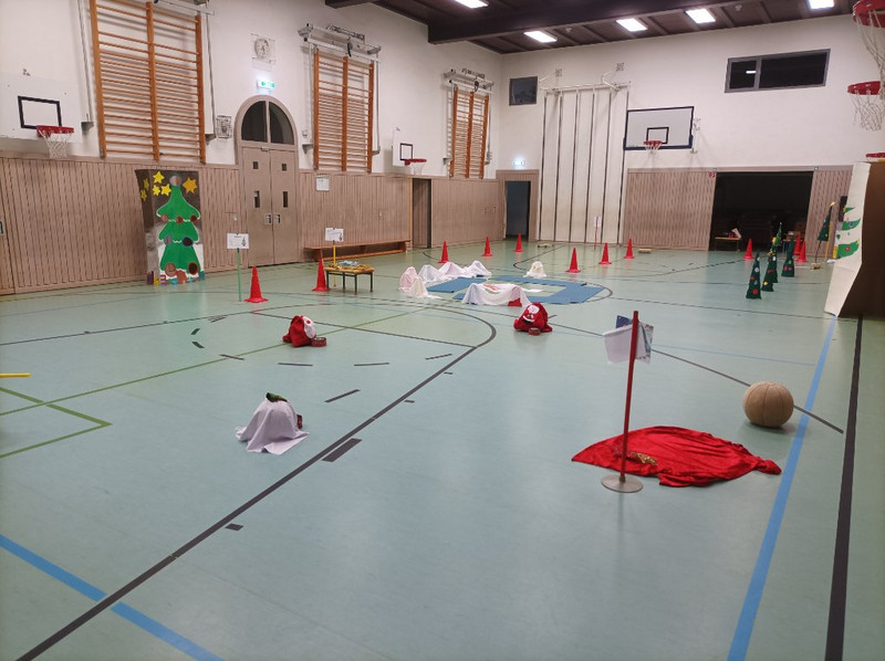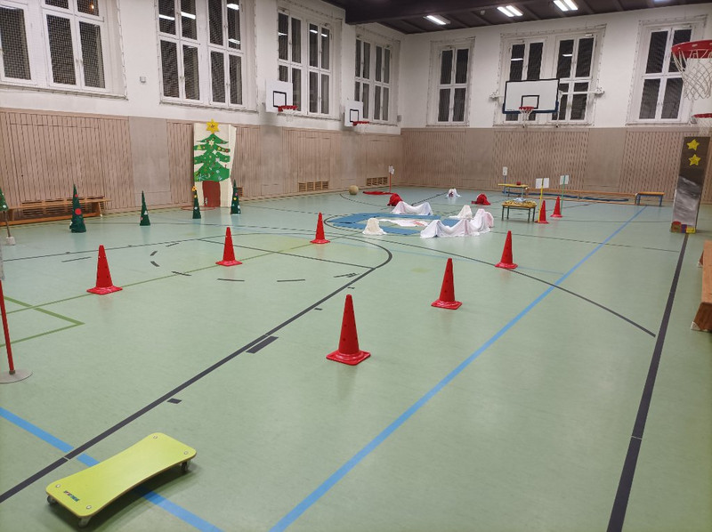 In den letzten Tagen fand in der unteren Turnhalle unserer Schule wie jedes Jahr unser geliebtes Nikolaussportfest statt. Trotz der widrigen, einschränkenden Umstände in diesem Jahr haben sich unsere Sportlehrer dennoch etwas Schönes einfallen lassen: so konnte sich jede Klasse eine Schulstunde lang an den insgesamt sechs weihnachtlichen Stationen austoben. Das Bewegungsangebot reichte dabei vom Schneeballwurf über eine Schlittenfahrt bis hin zu einem Balanceakt mit Zusatzaufgabe und einer Skitour im Slalom um aufgestellte Tannen. Beim winterlichen Treiben hatten alle Kids unterstützt von weihnachtlichen Klängen viel Freude - eine gelungene Abwechslung zum eher grauen Schulalltag. Ganz besonderer Dank an Sarah, die den Stationsbetrieb betreut und immer wieder hergerichtet hat. Danke Sportis!