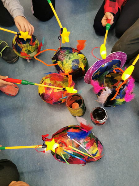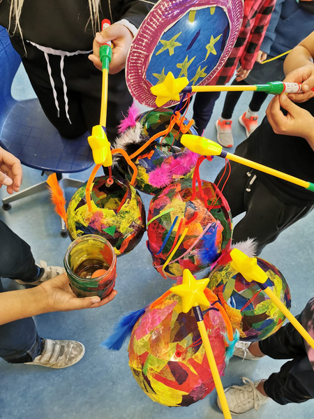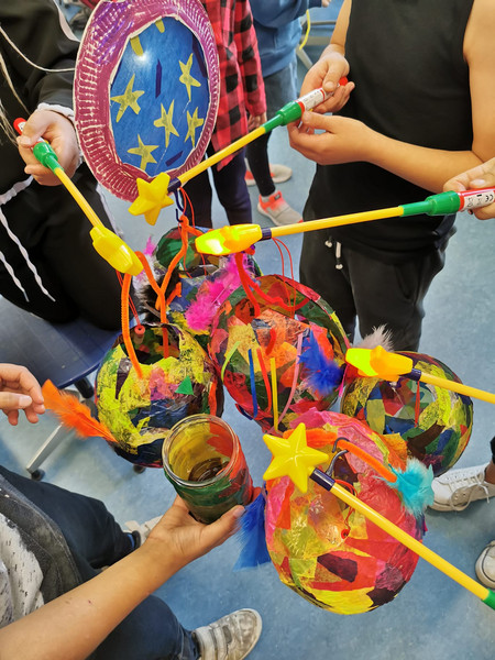 Gemeinsam mit Frau Blazejczyk, Ayat, Katrin und Herrn Fuchs haben die Kinder der Klasse Plus heute pünktlich zum Laternenfest ihre Laternen fertiggestellt. Über einen aufgeblasenen Luftballon haben sie dafür mit Transparentpapier und Tapetenkleister eine Oberfläche gespannt, die richtig trocken eine leichte und flexible Laterne bildet. Leider sind einige Ballons im Prozess geplatzt - doch mit Marmeladengläsern gewappnet konnten die Schülerinnen und Schüler noch tolle Teelichtgefäße daraus basteln. Viel Freude, Kleckse und Gemurmel haben die Stunden begleitet.