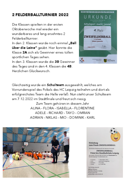 Gleichzeitig wurde ein Schulteam ausgewählt, welches am Vorrundenspiel des Pokals des HC Leipzig teilnahm und dort als erfolgreichstes Team die Halle verließ. Nun steht unser Schulteam am 7.12.2022 im Stadtfinale und freut sich riesig.