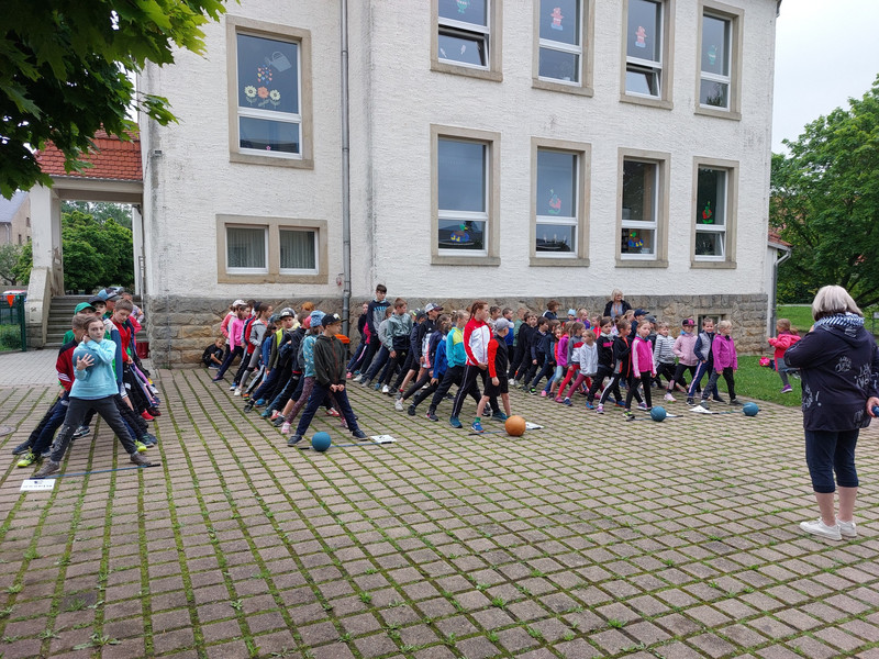 Sportfest zum Kindertag 2024 Sportfest zum Kindertag 2024 03.06.2024 traditionelle Eröffnung auf dem Schulhof Wurfspiel Sprint Siegerehrung Medizinballstoßen Weitsprung
