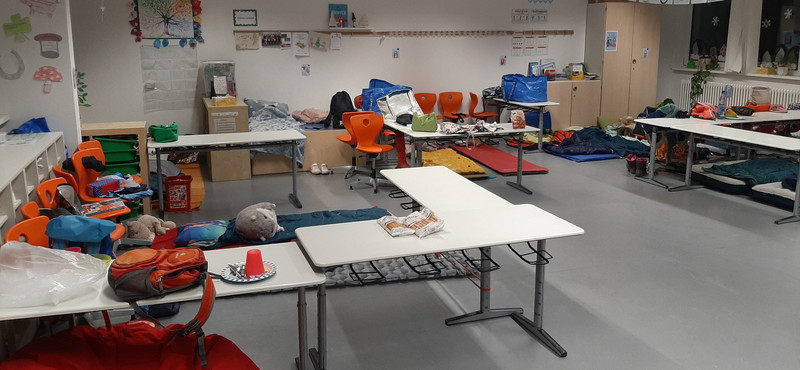 Ziemlich geschafft, aber glücklich wanderten wir zum Schluss in unsere jeweiligen Klassenzimmer nach oben. Alle schlüpften erst in ihre Schlafsachen und danach in ihre Schlafsäcke. Es wurde noch ein bisschen gelesen und geplaudert und irgendwann fielen auch die Letzten in den Schlaf - je nach Klasse ganz unterschiedlich :).