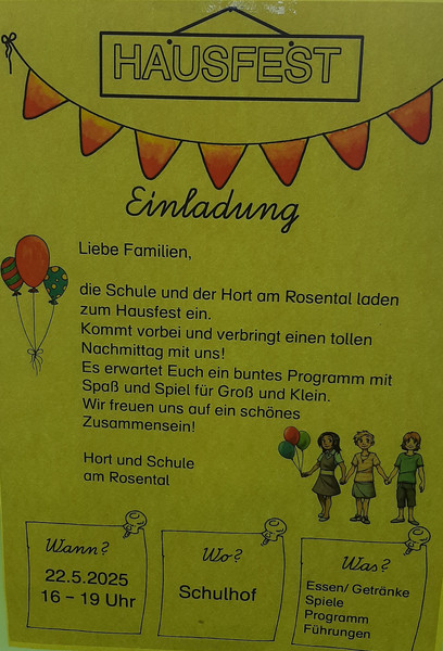 Auch das Hausfest am 22. Mai ist schon in Planung. Es erwarten euch wieder viele spannende Stationen und Platz zum Austoben, kreativ sowie sportlich. An diesem Tag sind auch für alle anderen unsere Türen geöffnet und es am Tag der offenen Tür Einblicke in unser Schulleben.