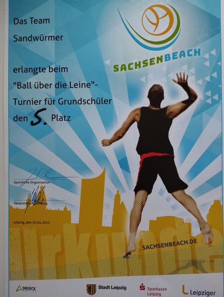 Mit einem spitzen Team haben 8 Schülerinnen und Schüler aus den Klassenstufen 2 bis 4 (Cajus, Eliott, Vera und Moritz, Franz, Basira, Mathilda und Leopold) unsere Schule beim Ball über die Leine Turnier vertreten. Sie haben 6 Spiele gewonnen und 1 Spiel verloren. Von 23 Teams belegten die Sandwürmer (Teamname) einen erfolgreichen 5. Platz.
