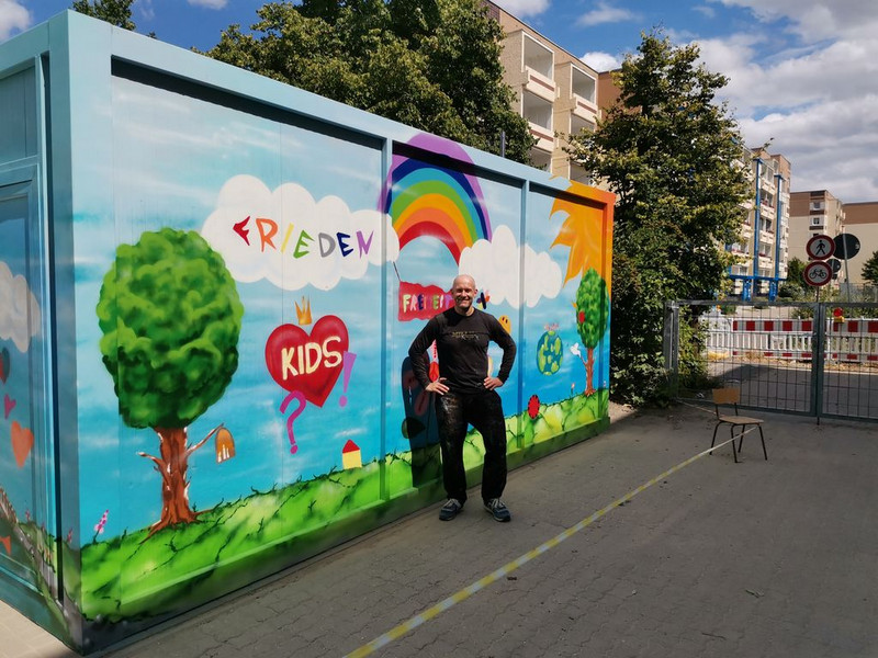 In den Sommerferien haben Kinder verschiedener Klassenstufen gemeinsam mit dem Künstler Patrick Seifried den Container auf dem Schulhof der Zwergenburg verschönert. Es wurden fleißig Ideen gesammelt. Hierfür konnten alle Kinder der Schule Vorschläge einreichen. Die fleißigen Künstler haben aus diesen Ideen Motive entworfen und skizziert. Daraus wurden Schablonen erstellt. Dann erst konnten die Kinder mit Farbdosen die vielen tollen Motive an den Container bringen. Der Aufwand hat sich gelohnt! Unser Dank gilt Herrn Seifried und den fleißigen Künstlern!
