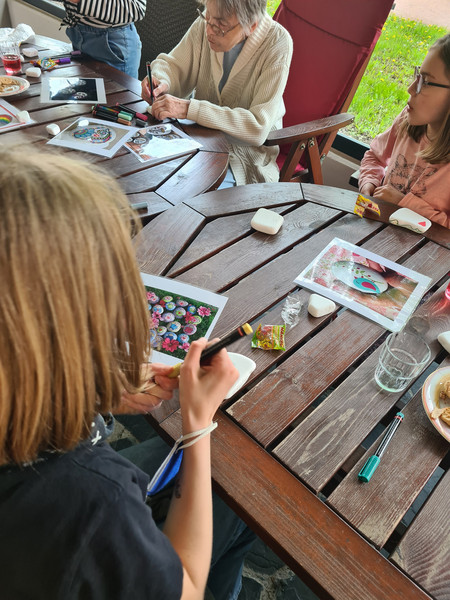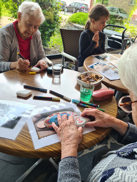 Bei schönem Wetter konnten wir im Atrium des Seniorenheims Kleinzschocher schöne Steine bemalen. Dafür inspirierte uns die Geschichte der Schmunzelsteine, die Frau Meyer, die Ergotherapeutin des Seniorenheims, zu Beginn vorlas. Es hat uns sehr viel Spaß gemacht, Steine zu bemalen die dem/ der ein oder anderen beim Schenken oder uns selbst beim Betrachten ein Lächeln ins Gesicht zaubern. Einige Geschichten der Bewohnerinnen zur Gestaltung der Steine ließen auch mal ein Tränchen fließen.