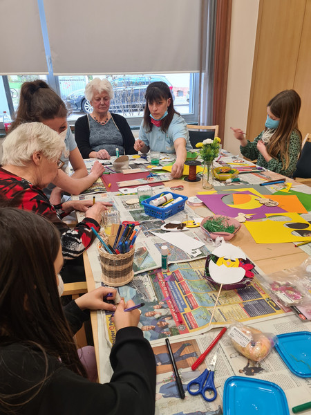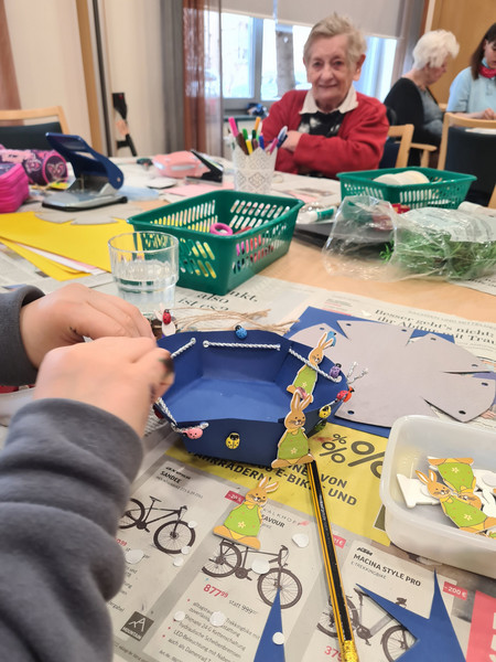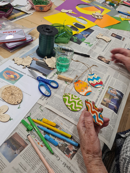 Wow, so viel tolles, buntes Material was zum österlichen gestalten einlud! Wir gestalteten gemeinsam Osterkörbchen, ein Küken was aus einem Ei „schlüpft“ oder bemalten Holzanhänger für einen Osterstrauß. Mit gegenseitiger Unterstützung und einigen Lachern macht es noch viel mehr Spaß.