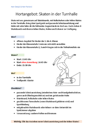 Mittwochs findet das Hortangebot Skaten in der Turnhalle statt. Die Teilnahmeliste hängt immer zu Beginn der Woche aus, in der das Angebot stattfindet. Alle wichtigen Information können der PDF-Datei entnommen werden. Bei schönem Wetter im Frühling und im Sommer besuchen wir in einer kleineren Gruppe die umliegenden Skateparks. Hierüber informieren wir zeitiger.