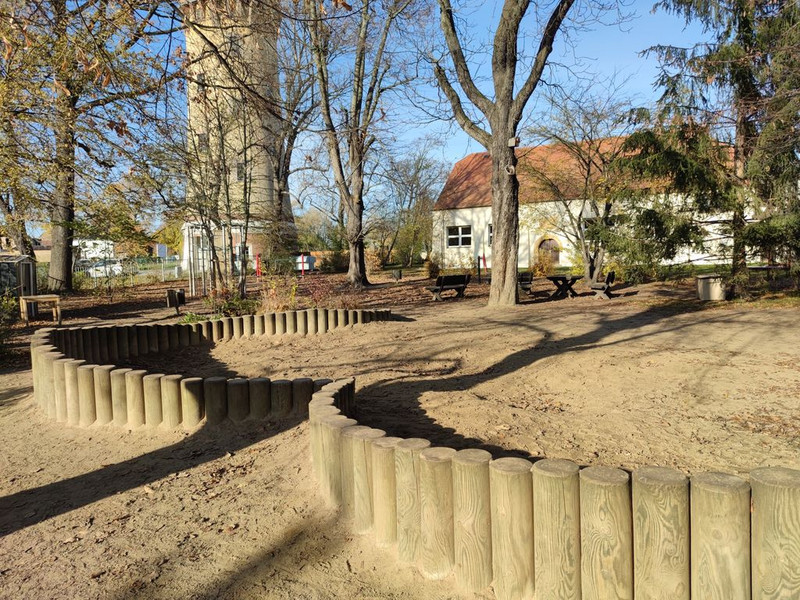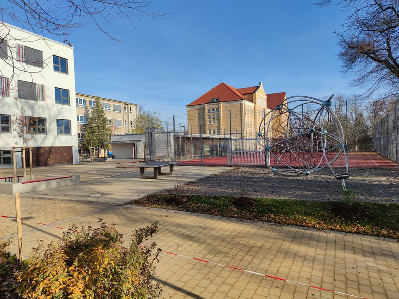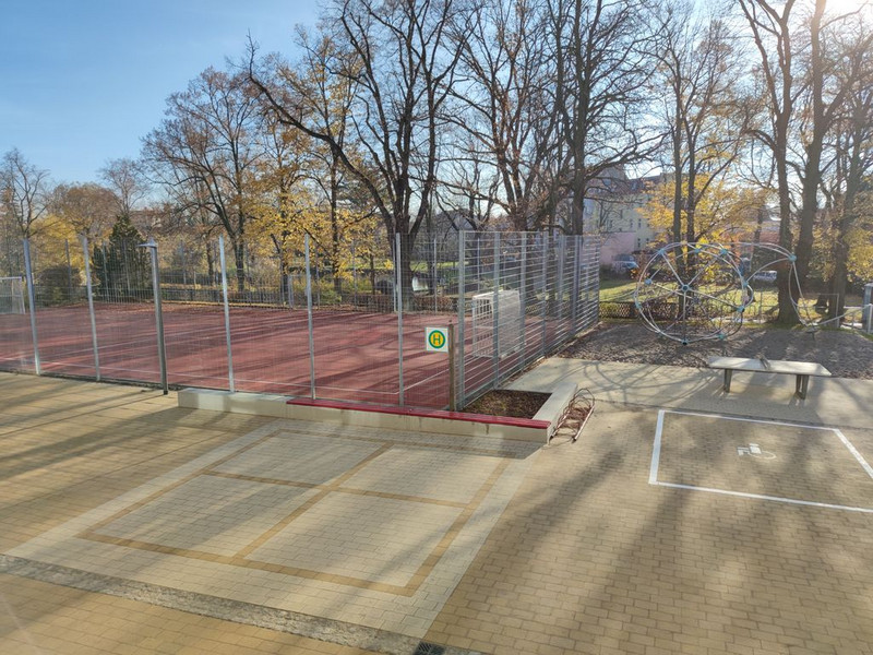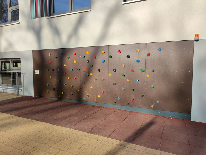 Außengelände Klettergerüst und Tischtennisplatte Hortgarten mit Sandkasten und großer Wiese Boulderwand Fußballplatz und King-Feld