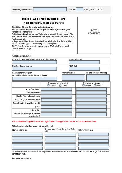 Die Notfallinformation bringen Sie bitte zum Vertragsabschluss mit. Um eine optimale Betreuung Ihres Kindes zu gewährleisten, müssen die Daten immer aktuell sein. Sollte sich bei Ihnen etwas ändern (Adresse, Familienstand, Telefonnummer, Mailadresse), dann teilen Sie uns dies bitte unverzüglich mit.