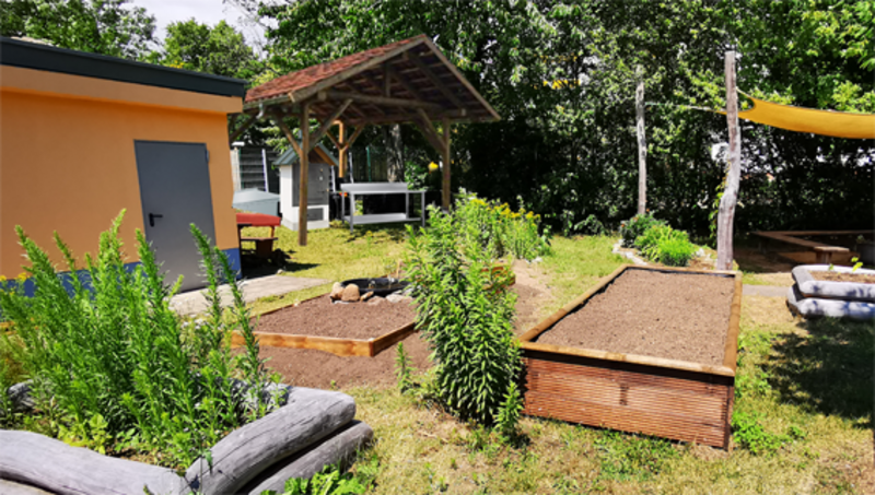 Rings um den neuen Steinbackofen wurde gemeinsam mit Mitteln des GTA ein überdachter Platz für die Klassen und Hortgruppen errichtet.