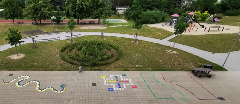 Mit den erlaufenen Sponsorengeldern des ersten Sponsorenlaufs des Fördervereins wurde ein Labyrinth auf dem Schulhof gepflanzt und die Malereien und Bewgungsspielfelder erneuert.