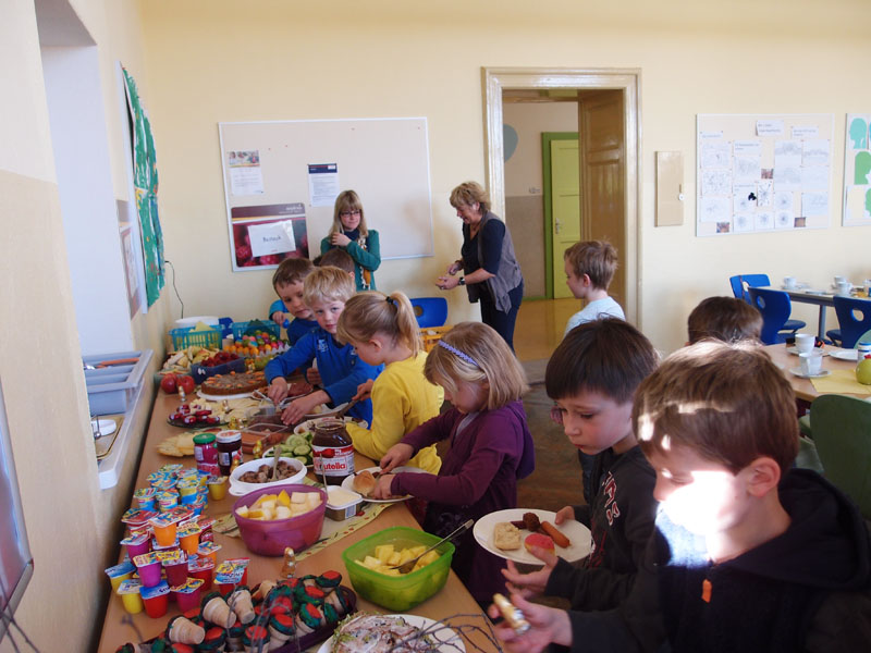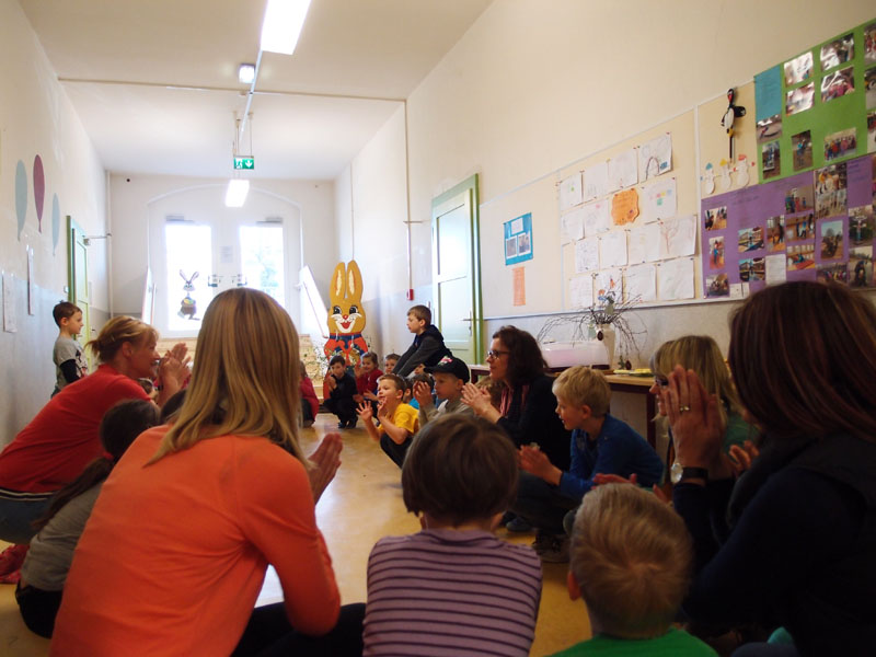 Mit einem gemeinsamen Frühstück starteten wir in den Gründonnerstag. Nach erfolgreichem Gestalten und Schreiben der Osterkarten eroberten wir das Schulgelände und suchten unsere Osternester. Der Osterhase hat es uns manchmal ganz schön schwer gemacht! Anschließend boten drei Gruppen ihre musikalischen Arbeitsergebnisse des Hörspaziergangs erfolgreich dar.