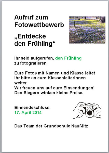 Zum 10. Mal fand der schulinterne Fotowettbewerb der Grundschule Naußlitz statt. "Umweltdetektive" waren mit dem Fotoapperat, dem Handy oder dem Tablet unterwegs. Der diesjährige Wettbewerb zählte über 50 Teilnehmer. Herzlichen Glückwunsch den Gewinnern, die durch eine Jury ermittelt wurden.
