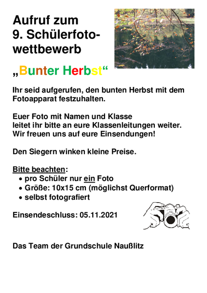 Wir haben uns riesig gefreut, dass zum diesjährigem Fotowettbewerb so zahlreiche Einsendungen erfolgten. Der Herbst präsentierte sich auf allen Fotos in seiner bunten Pracht. Herzlichen Glückwunsch den Siegern! Gewonnen hat Anna aus der Klasse 2b.