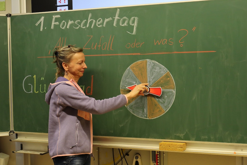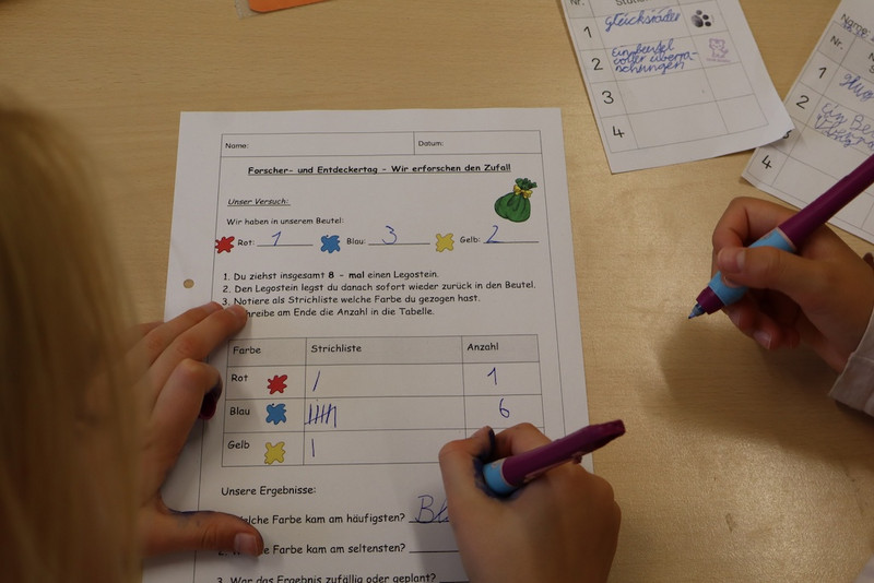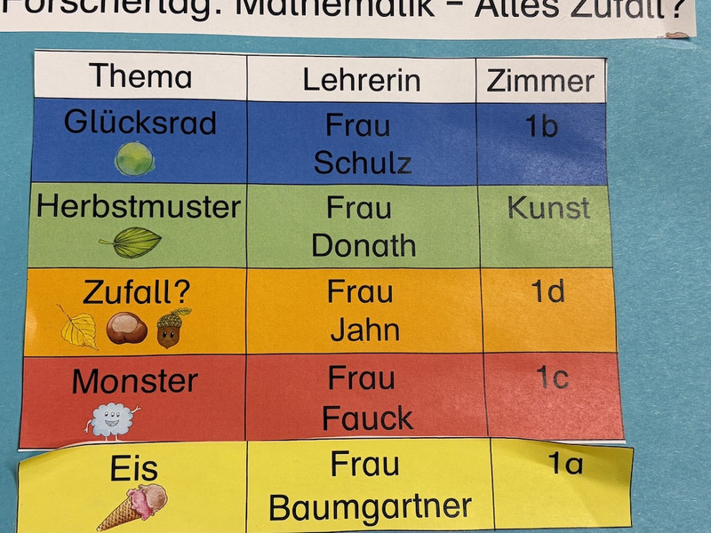 Am 27. Oktober 2025 fand unser 1. Forscher- und Entdeckertag des Schuljahres statt. Im Mittelpunkt stand das neue Lehrplanthema Mathematik - Zufall und Wahrscheinlichkeit. Alle Kinder hatten die Wahl, in vier verschiedenen Kursen den Zufall entscheiden zu lassen, Wahrscheinlichkeiten auszuprobieren oder das Glück herauszufordern. Alle hatte dabei viel Spaß! Jede Schülerin oder jeder Schüler hatte mittels Los noch die Möglichkeit, einen von 5 mathematischen Preisen zu gewinnen.