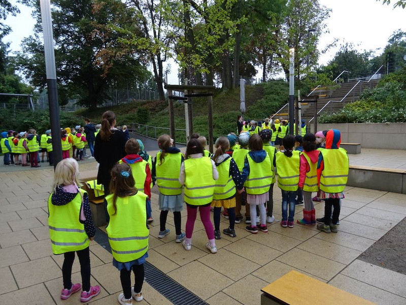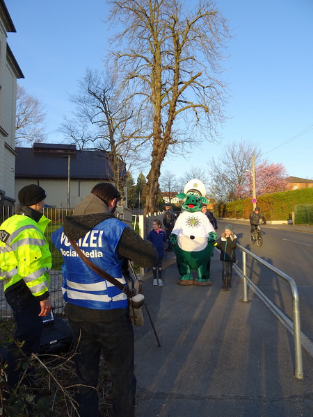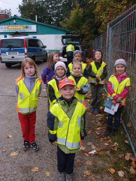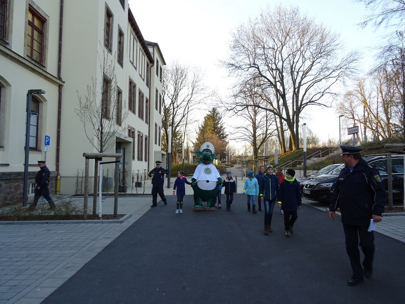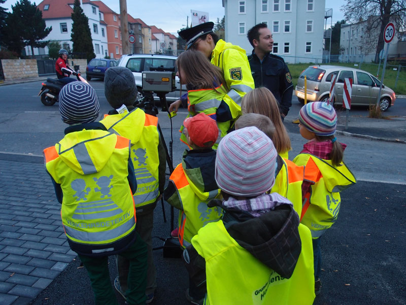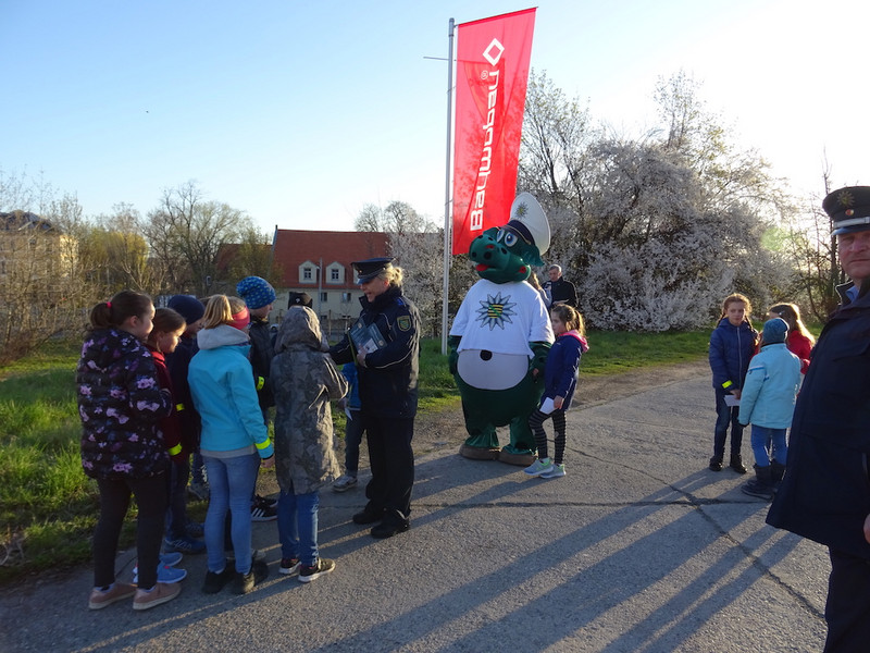 Schon zum zweiten Mal nach Oktober 2013 durften einige Schülerinnen und Schüler der Klassenstufe 3 gemeinsam mit der Polizei - unterstützt vom Maskottchen Poldi - mit selbst gestalteten Karten vorbildliche Autofahrer loben und zu schnelle Rad- und Autofahrer verwarnen.