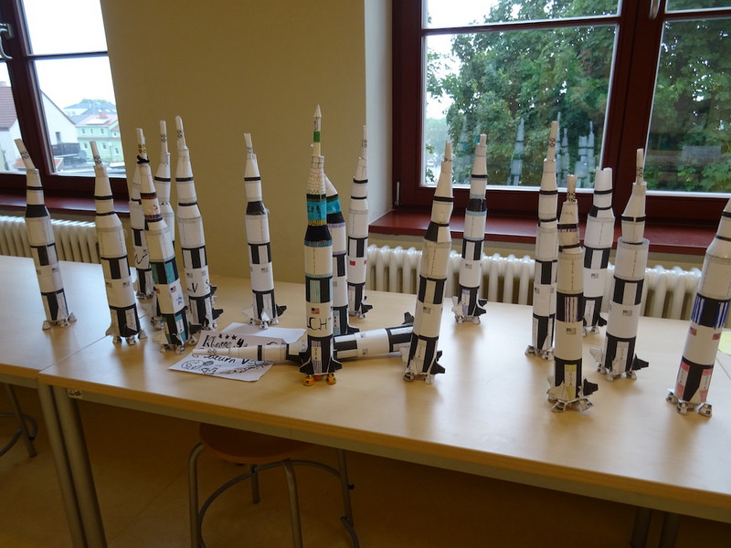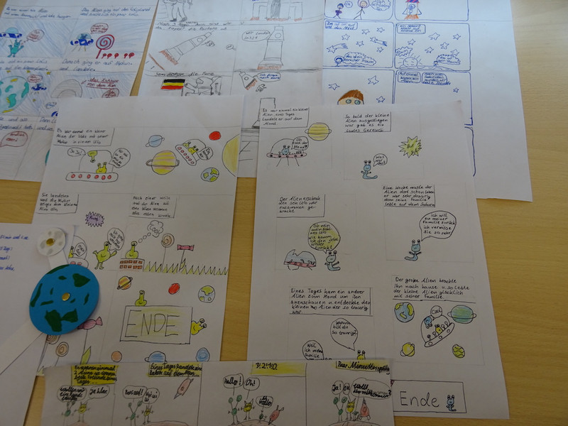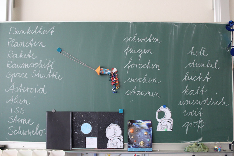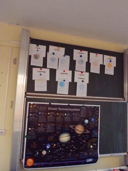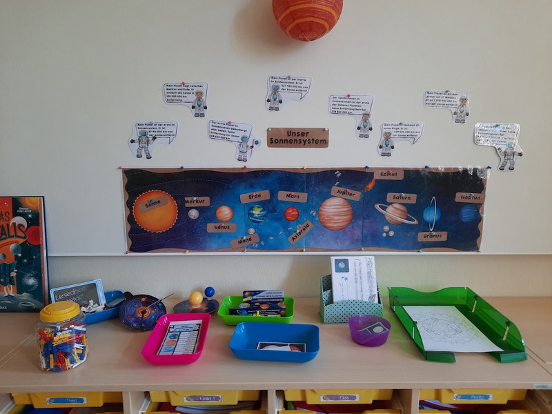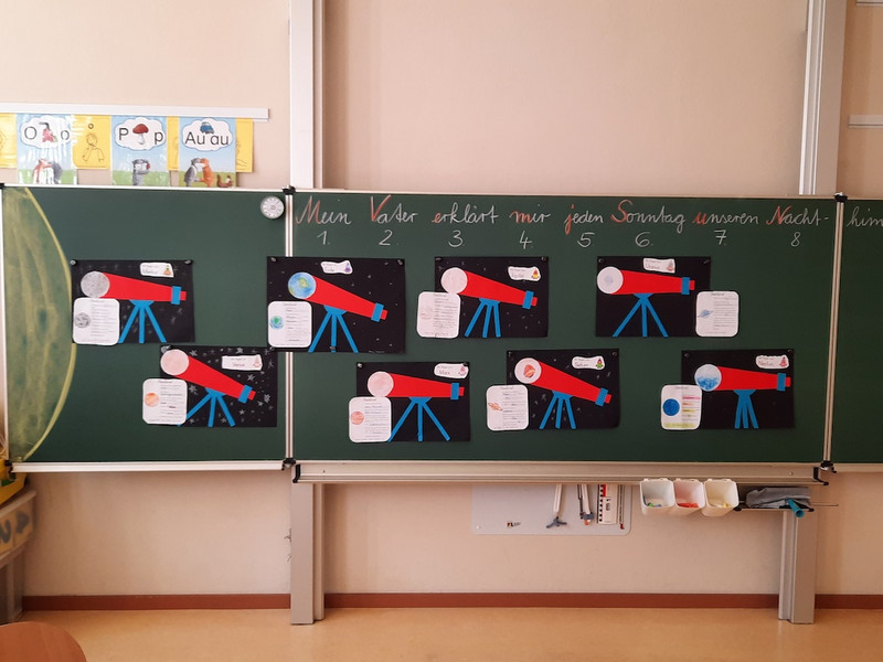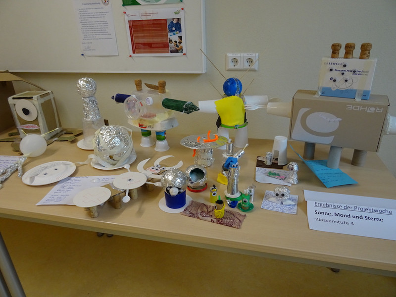 Vom 14.06.2021 bis 18.06.2021 fand die Jahresprojektwoche zur Thematik "Weltall" statt. Hierzu stimmten die Schülerinnen und Schüler aus mehreren Vorschlägen des Kinderrates ab. Auf Klassenebene beschäftigen sich die Kinder mit dem u.a. mit der Entstehung der Erde, unserem Planetensystem, der Raumfahrt oder außerirdischem Leben. In unserem MINT-Raum konnten alle Schülerinnen und Schüler viele Arbeitsergebnisse der anderen Klassen in einer kleinen Ausstellung bestaunen.