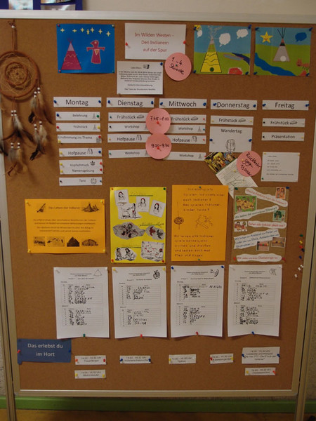 In der ersten Juniwoche 2014 eroberten wir den "Wilden Westen". In verschiedenen Workshops erfuhren wir Wissenswertes über das Leben der Indianer. Wir bauten verschiedene Behausungen nach, unterhielten uns mittels Zeichensprache, spielten die Spiele der Prärieindianer und fertigten indianischen Schmuck. Am Donnerstag zog unsere Stamm nach Radebeul ins "Karl-May-Museum". Mit Pfeil und Bogen erkundeten wir das Außengelände und neugierig die Ausstellung in der Villa Bärenfell. Am Freitag freuten wir uns über kleine und große Besucher. Den Schulanfängern, den Eltern und Großeltern präsentierten wir stolz, was wir in der Woche alles gelernt haben.