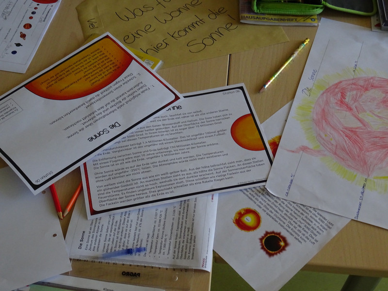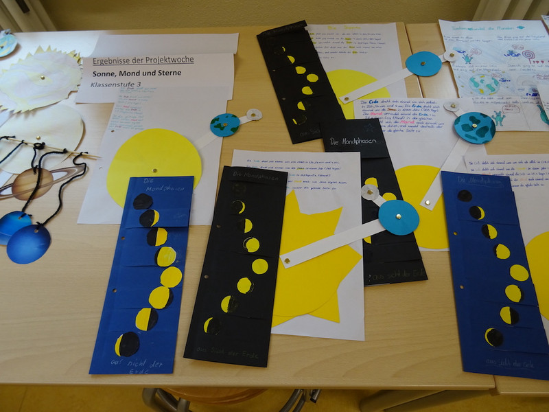 Vom 5. bis 9. September 2016 forschten die Schülerinnen und Schüler jahrgangsübergreifend in Projektgruppen zur Thematik "Sonnen, Mond und Sterne". Die Kinder lernten Interessantes und Wissenswertes über den Weltraum, die Raumfahrt, das Sonnensystem, den Mond und die Erde kennen. Unterwegs trafen sie natürlich auch auf Außerirdische. Bei einem Ausflug ins Planetarium Radebeul bestaunten sie die schwarzen Flecken auf der Sonnen und bekamen den Sternenhimmel erklärt. Am letzten Tag präsentierten alle Gruppen ihre Ergebnisse und waren zu Gast im Weltraumtheater.