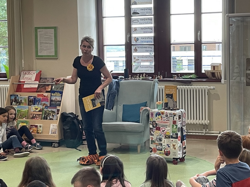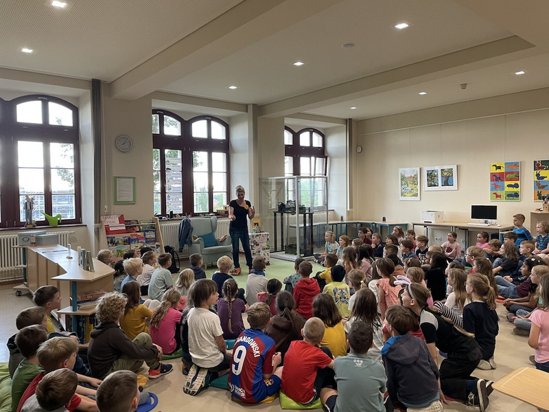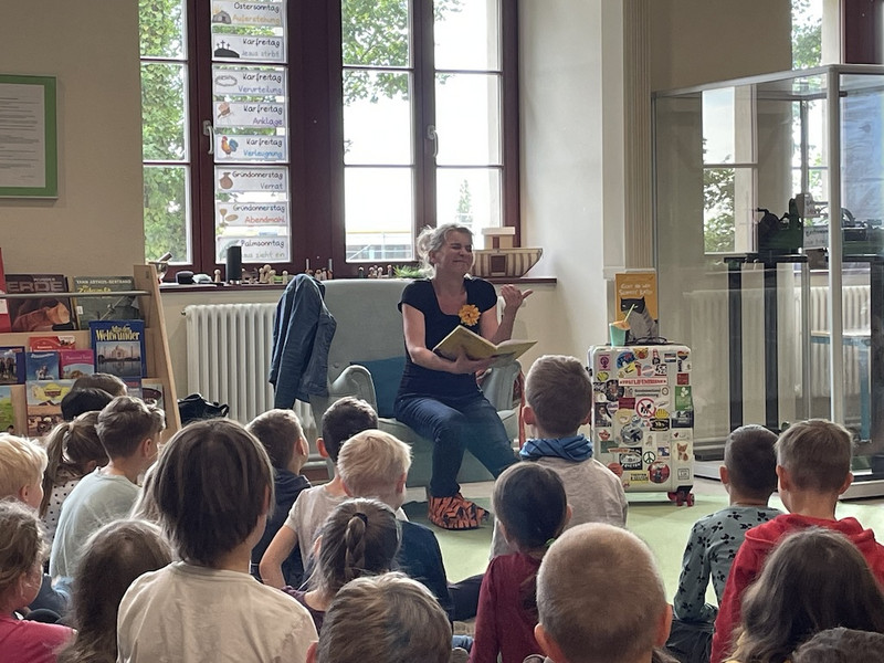 Die Kinderbuchautorin, Frauke Angel, besuchte uns nun schon zum 2. und 3. Mal. Am 31. Mai 2024 las sie für die Klassenstufen 1 und 2 "Geht ab wie Schmidts Katze". Ihr Buch "Tagebuch eines Überfliegers" stellte sie am 11. Juni 2024 den Dritt- udn Viertklässlern vor. Es wird sicherlich nicht ihr letzter Besuch bei uns gewesen sein.
