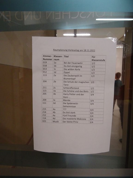 Am 18. November 2022 beteilgte sich die Grundschule Naußlitz wieder am Bundesweiten Vorlesetag. Zu Gast waren erneut die Berufsschülerinnen und -schüler des DRK Sachsen. Als angehende Erzieherinnen und Erzieher suchten sie passende Kinderliteratur heraus, gestalteten Plakate und begeisterten die Kinder in Kostümen und passender Raumdekoration für Literatur.