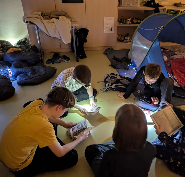 Viele Klassen gestalten in der Grundschule Naußlitz einen Leseabend. Gemeinsam richten sich die Schülerinnen und Schüler Leseecken, Lesezelte o.a. Orte ein, wo sie sich in einer stimmungsvollenn Atmosphäre ihren Lieblingsbüchern widmen.