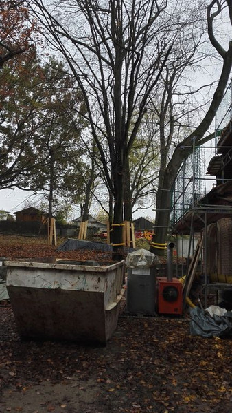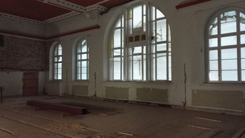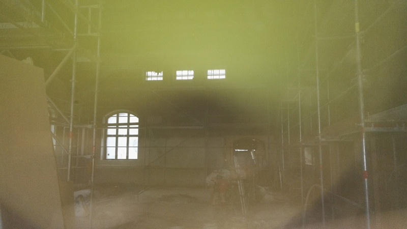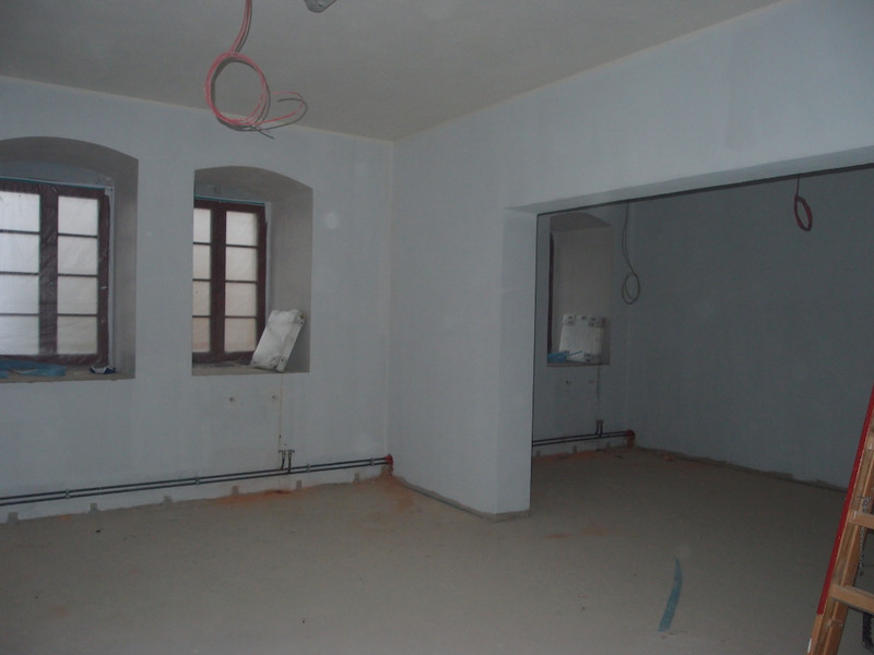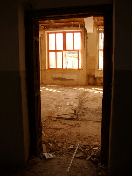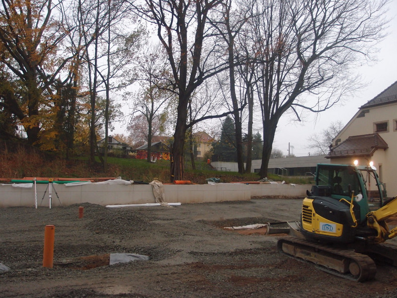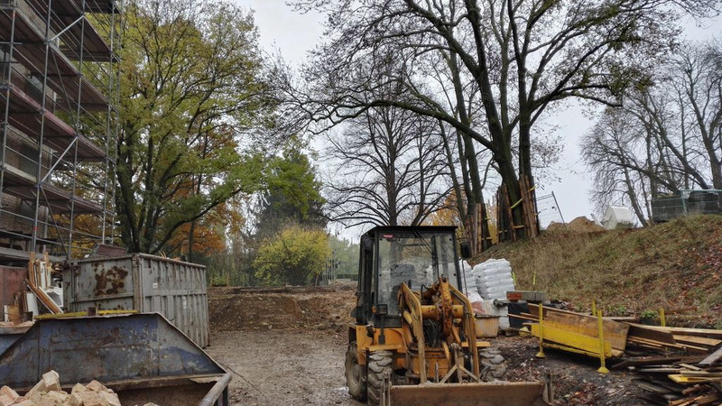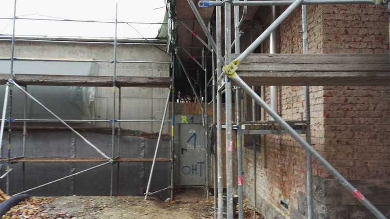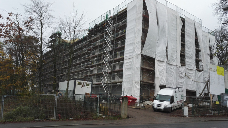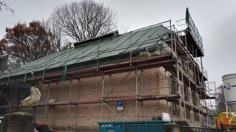 Inzwischen wurde fleißig abgerissen, abgeklopft, neu gebaut, Fenster eingesetzt, der Dachstuhl ausgebessert ... In Kürze wird das Dach gedeckt. Auch im Außenbereich wird gebaggert und die Sportanlagen werden angelegt.