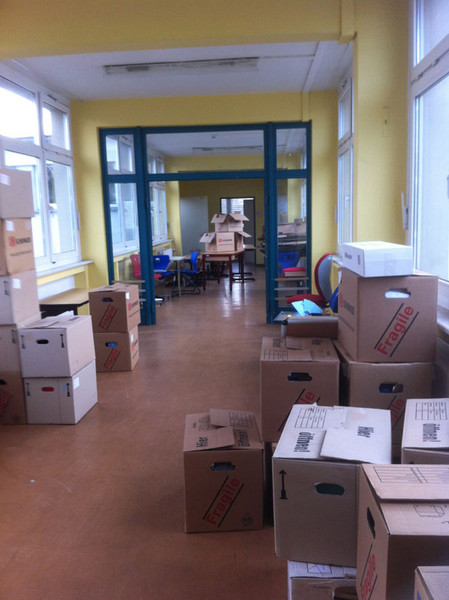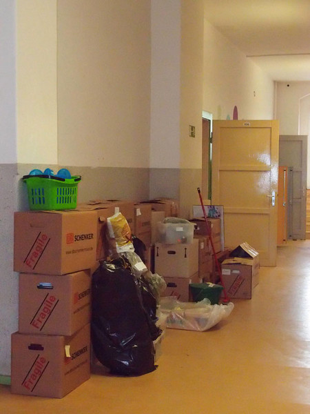 In den Winterferien 2016 fand der Umzug der Grundschule Naußlitz ins Ausweichquartier statt. Nach einiger Verzögerung konnten alle Kolleginnen mit ihren fleißigen Helfern ab 11.02.2016 Möbel rücken, Flecken putzen, Etiketten lösen, zahlreiche Kisten auspacken und für alle Schülerinnen udn Schüler die Räume ansprechend einräumen und gestalten. Ein großes Dankeschön gilt unserem Hausmeister, Herr Fruhnert, und dem Putzteufelteam. Wir haben noch nicht alle Kleinmöbel und Kisten wiedergefunden!