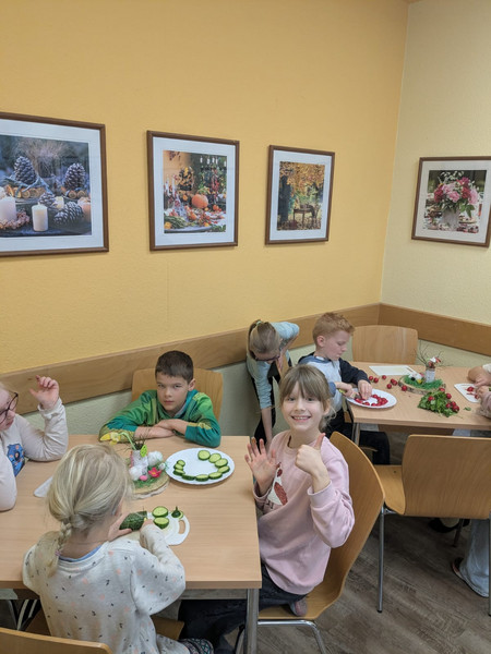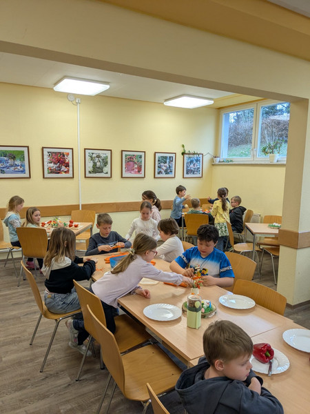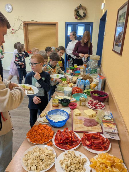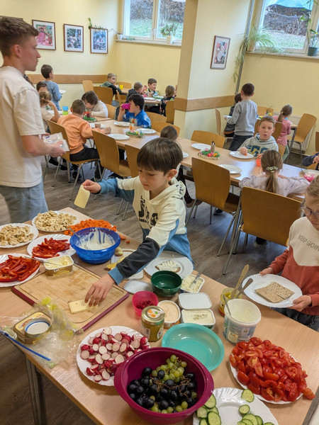 Mit viel Freude und Engagement brachten die Kinder verschiedene gesunde Zutaten von zu Hause mit: frisches Obst und Gemüse, Knäckebrot, Käse, Joghurt und vieles mehr. Gemeinsam wurde gewaschen, geschnitten und angerichtet.