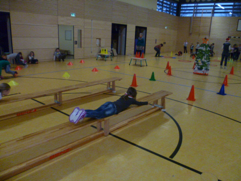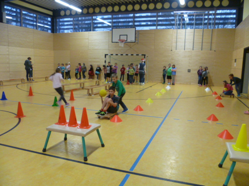 Einmal im Monat werden die 1.+2. Klassen und die 3.+4. Klassen mit den Projektleitern und einer Erzieherin mit Bewegungsspielen geschult.