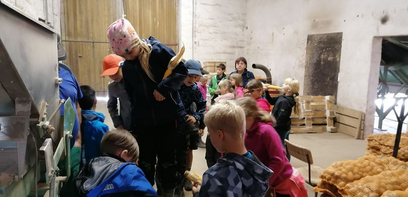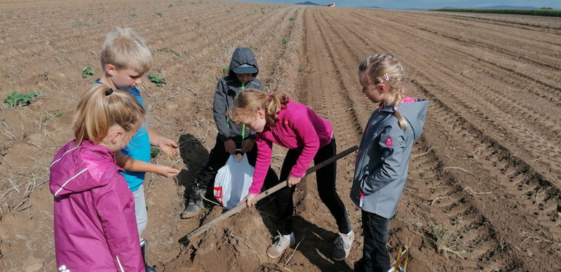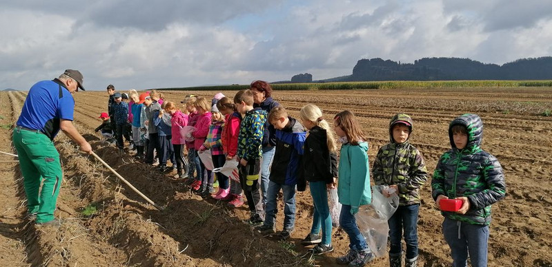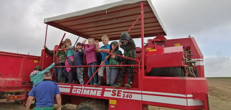 Am Dienstag, dem 17. September, statteten unsere 3. Klassen der Agrargenossenschaft in Reinhardtsdorf wieder einmal einen Besuch ab. Diesmal interessierten wir uns dafür, wie und wo Kartoffeln wachsen und geerntet werden. Wie immer wurden wir freundlich empfangen und Herr Hering, der sich viel Zeit für uns nahm, erzählte uns alles Wissenswerte über Herkunft, Geschichte, Wachstum und Verwendung von Kartoffeln. Alle durften auf der Kartoffelkombine mitfahren und den Erntevorgang direkt miterleben. Aber auch selbst Hand bzw. „Hacke“ anlegen war angesagt! Die Kinder waren beeindruckt, wie viele Kartoffeln aus einer Pflanze entstanden und zeigten große Einsatzfreude beim „Kartoffellesen“! Schließlich durften sie ja auch einige mit nach Hause nehmen! Und jeder hatte eine andere Idee, was daraus werden sollte!