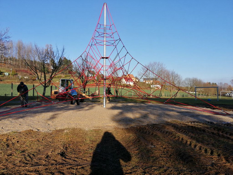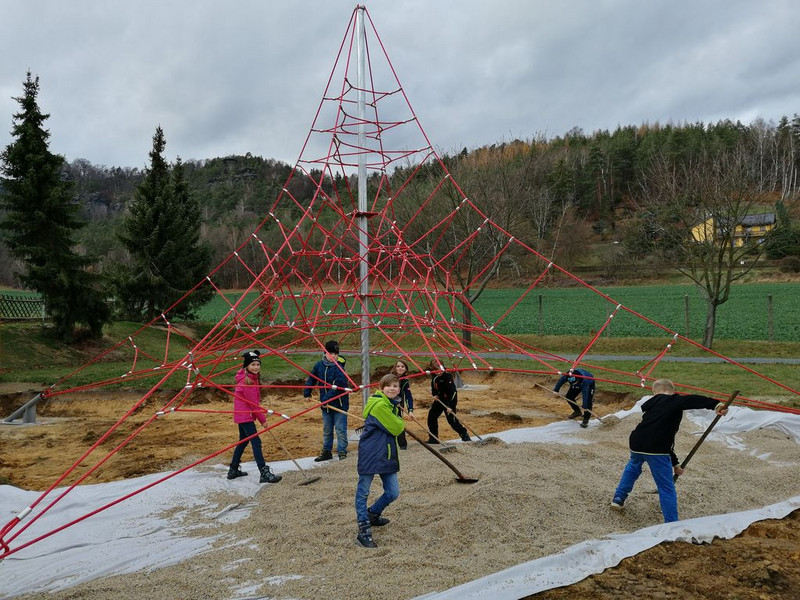 Im Juni als Ministerpräsident Kretschmer uns besuchte, versprach er den Kindern eine Kletterpyramide. Herr Hoof von der Ostsächsischen Sparkasse organisierte das nötige Geld, Herr Eisert vom Gemeinderat und Herr Frenzel aus Gohrisch setzten alles in Bewegung, damit die Firma Heilemann direkt nach Auslieferung der Kletterpyramide mit dem Aufbau beginnen konnte. Unser Hausmeister und das gesamte Bauhofteam verteilten gemeinsam mit der AG Bauen tonnenweise Fallschutzsand. Allen, die daran beteiligt waren – Vielen Dank!