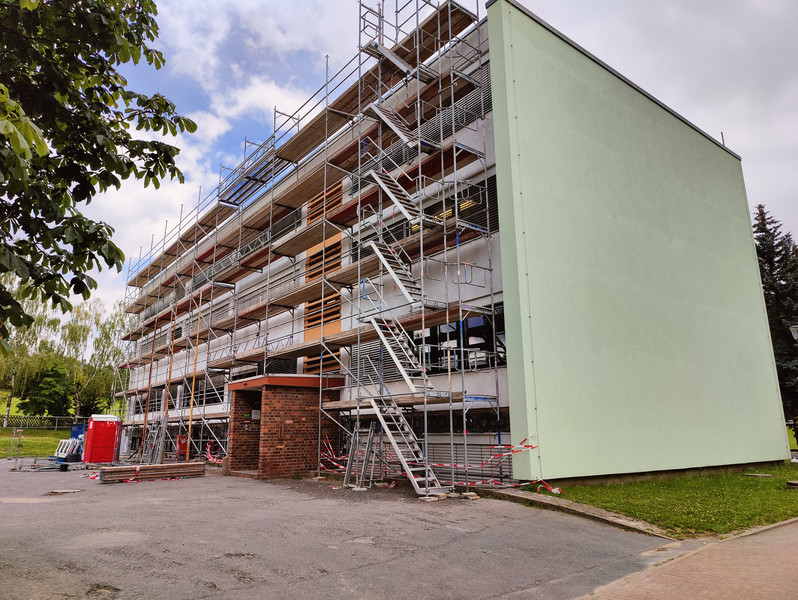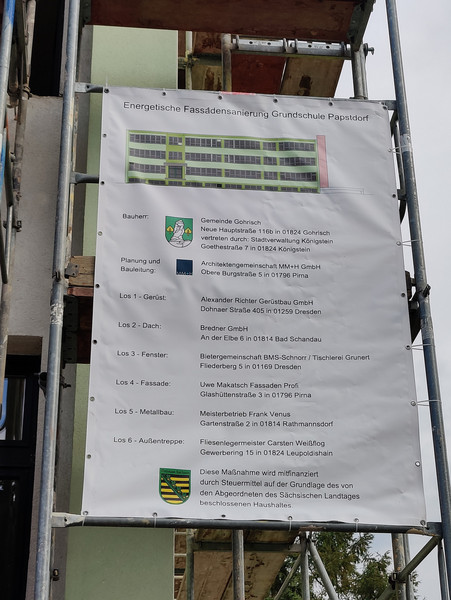 Ende Mai gab es den Startschuss zur energetischen Sanierung der Grundschule Papstdorf. Unser Schulträger, die Gemeinde Gohrisch, greift dabei trotz Förderung tief in die Tasche. Dabei werden die Fenster erneuert, das Dach repariert und die Fassade saniert. Die Bauarbeiten sollen voraussichtlich bis zum Ende der Sommerferien andauern.