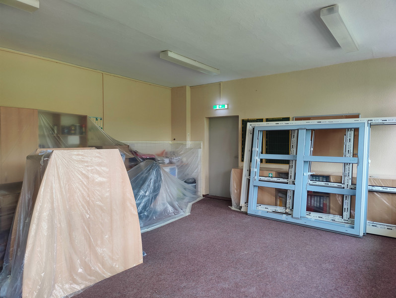 Aktuell sind die Bauarbeiten ausgesetzt (seit 20.06.24), denn es brüten seltene Vögel in der Fassade der Grundschule!